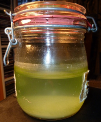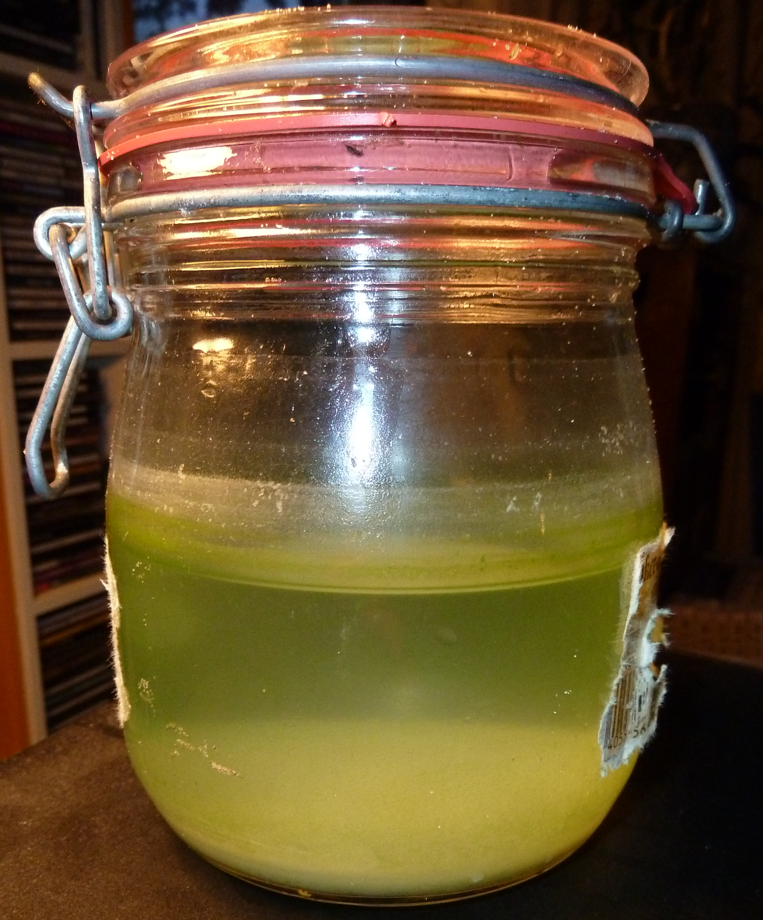 Als de temperatuur goed is voeg dan de zonnekweek uit stap 1 toe. Na enkele dagen (2 tot 5) zou het lichtgroene water donkerder groen moeten worden als teken dat onze kweek is aangeslagen.