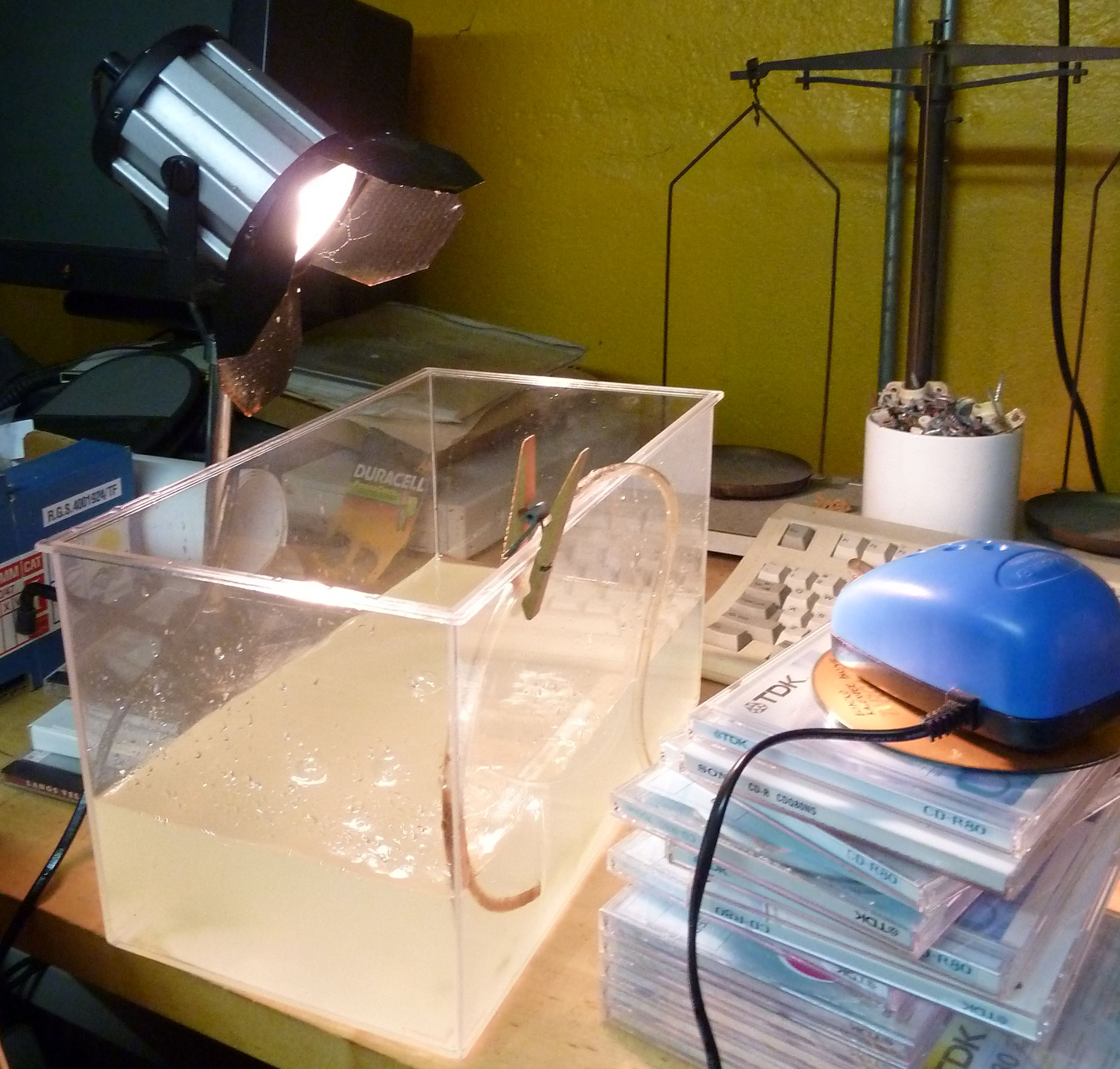 Voorzie het geheel van lucht via een bubbel apparaat. Volgens documentatie zou 2 blaasjes lucht per seconde ideaal zijn, maar wij hadden geen idee hoe dat te doen, dus gebruikten we een normale aquarium luchtpomp.