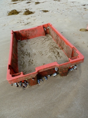 In de buurt van Egmond Binnen (vlak voor strandpaviljoen Zilverzand) troffen we een rood krat aan dat behoorlijk stuk was, en ook weer begroeid was met Eendenmossels.