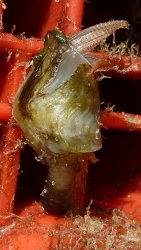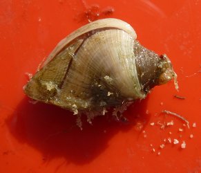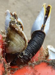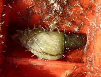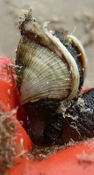 Bij omkeren van het krat troffen we ook kleine exemplaren aan van de Geplooide eendenmossel
