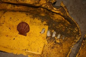 Bij ons huisje aangekomen werd de bodem uit de jerrycan gezaagd en met moeite kon ik de mantel tevoorschijn halen. De schelp stond wijd open en er waren geen vleesresten meer aanwezig. Nu de mantel veilig uit de jerrycan verwijderd was kon de jerrycan verder gesloopt worden en dit leverde nog een verrassing op namelijk vijf volwassen (tot 35 mm) Noordse rotsboorders die nog wel in leven waren.