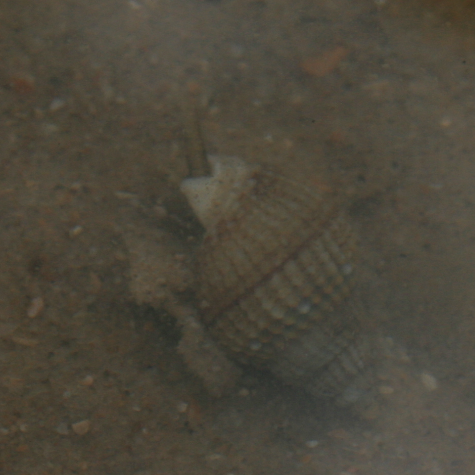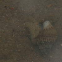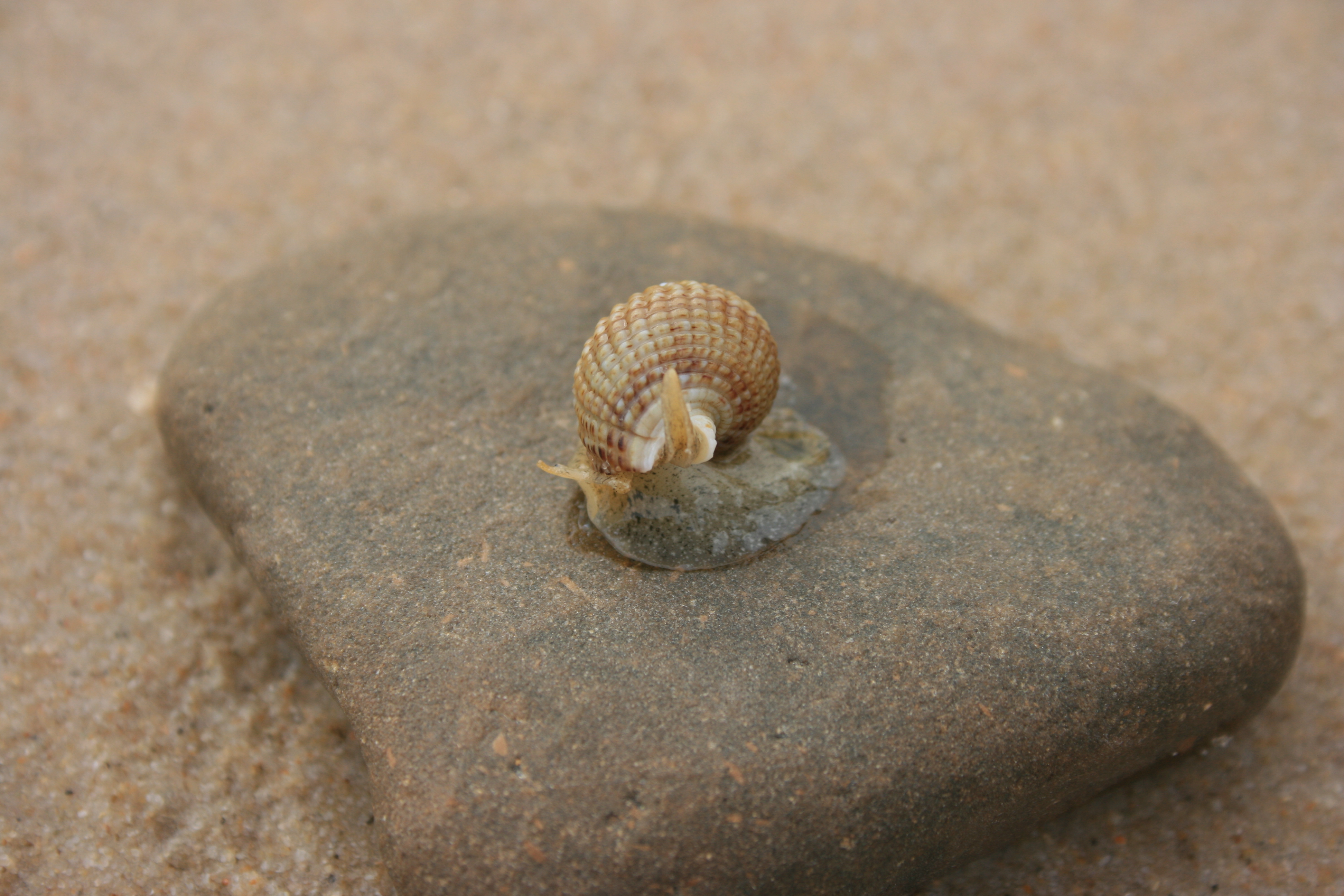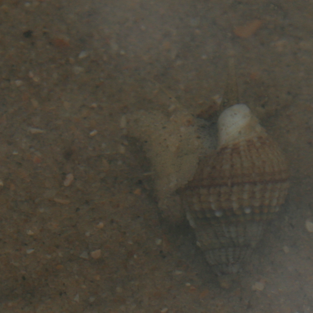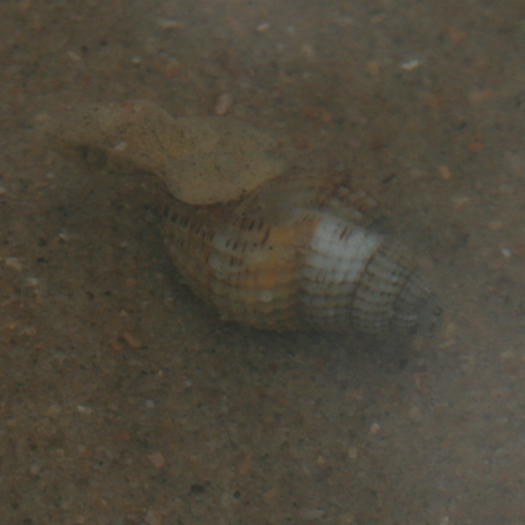 Uit de boekjes bleek dat de gevlochten fuikhoren vanaf de laagwaterlijn leeft. Om hem terug te zetten in zee (zonder dat de meeuwen hem direct als maaltijd zouden gebruiken) was het dus noodzaak om te wachten op laagwater. Het leek ons verstandig om in de tussentijd het beestje te voorzien van zand en water. De fuikhoren gaf een prachtige show weg toen we hem in het water zette. De grote voet kwam uit de horen, zocht naar grond en vond deze. De horen werd in de juiste richting gedraaid en het geheel verdween in een snel tempo onder het zand. Volgens de EXIF informatie van mijn camera zat er tussen de eerste en de laatste foto 1 minuut en 5 seconden: