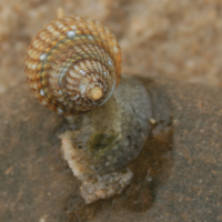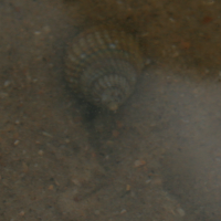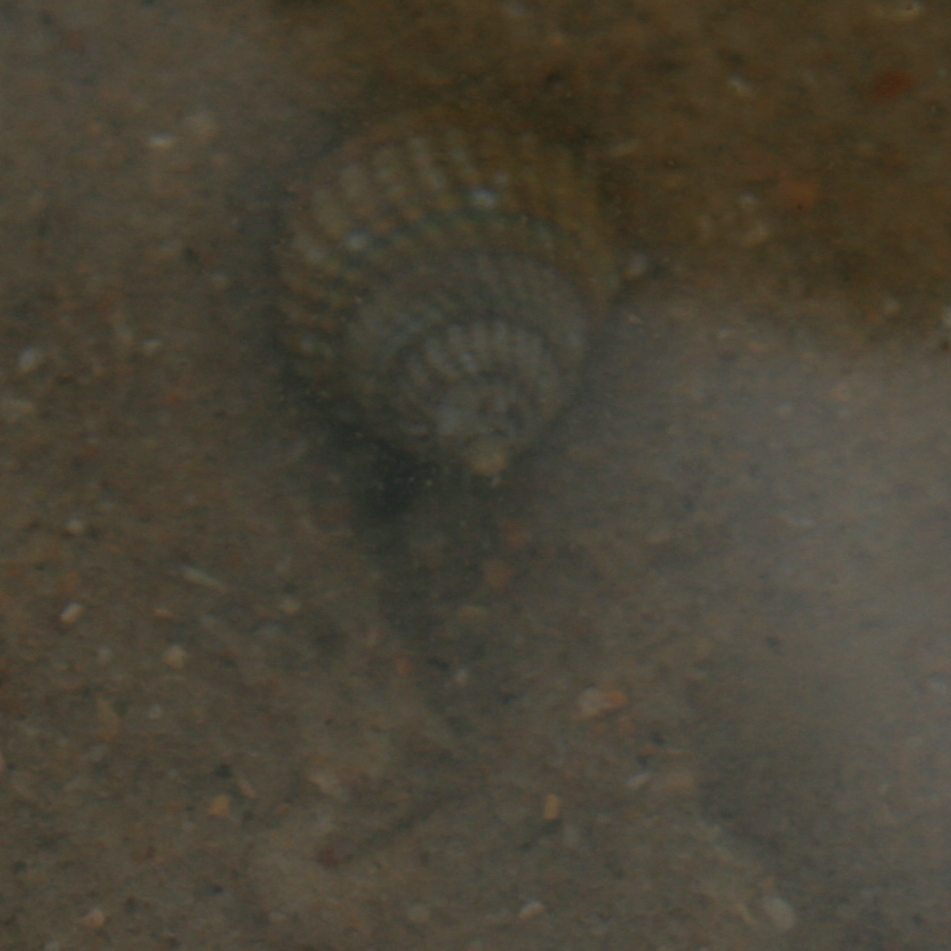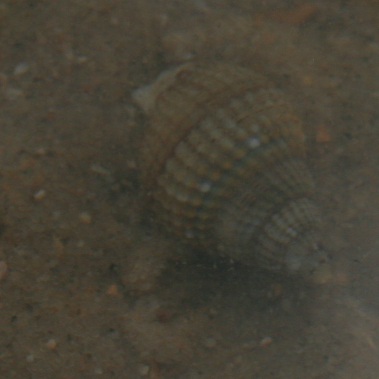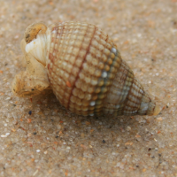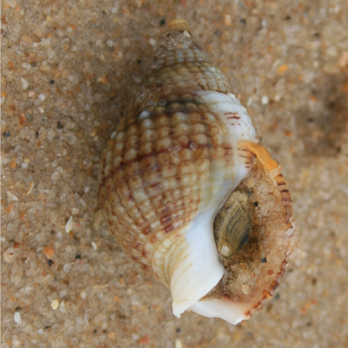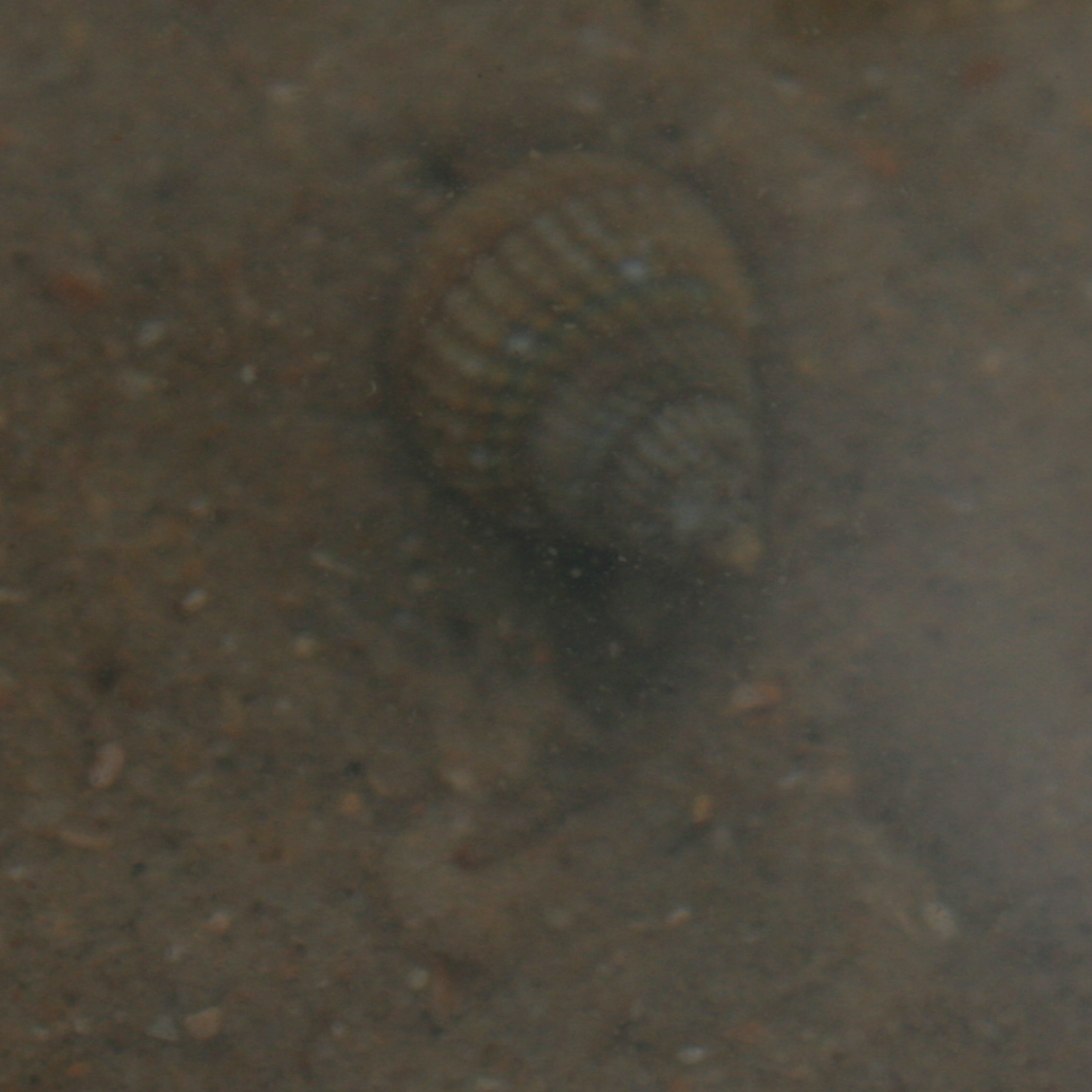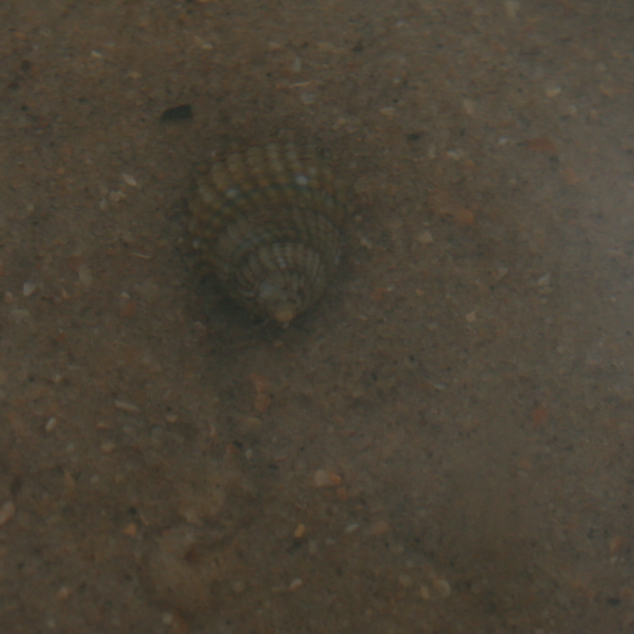 Uit de boekjes bleek dat de gevlochten fuikhoren vanaf de laagwaterlijn leeft. Om hem terug te zetten in zee (zonder dat de meeuwen hem direct als maaltijd zouden gebruiken) was het dus noodzaak om te wachten op laagwater. Het leek ons verstandig om in de tussentijd het beestje te voorzien van zand en water. De fuikhoren gaf een prachtige show weg toen we hem in het water zette. De grote voet kwam uit de horen, zocht naar grond en vond deze. De horen werd in de juiste richting gedraaid en het geheel verdween in een snel tempo onder het zand. Volgens de EXIF informatie van mijn camera zat er tussen de eerste en de laatste foto 1 minuut en 5 seconden: