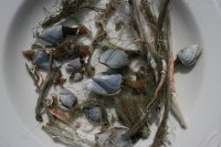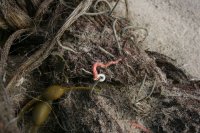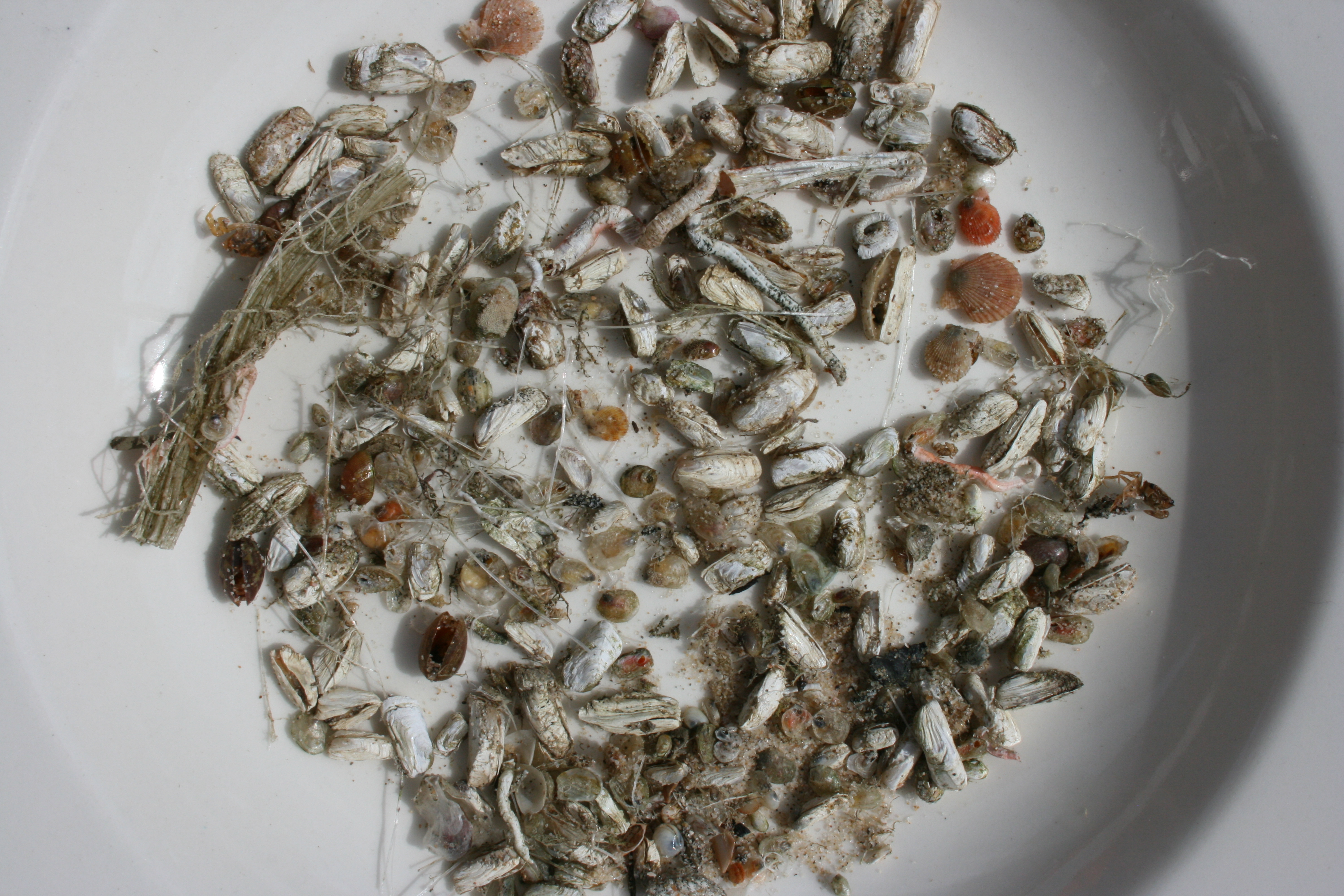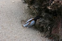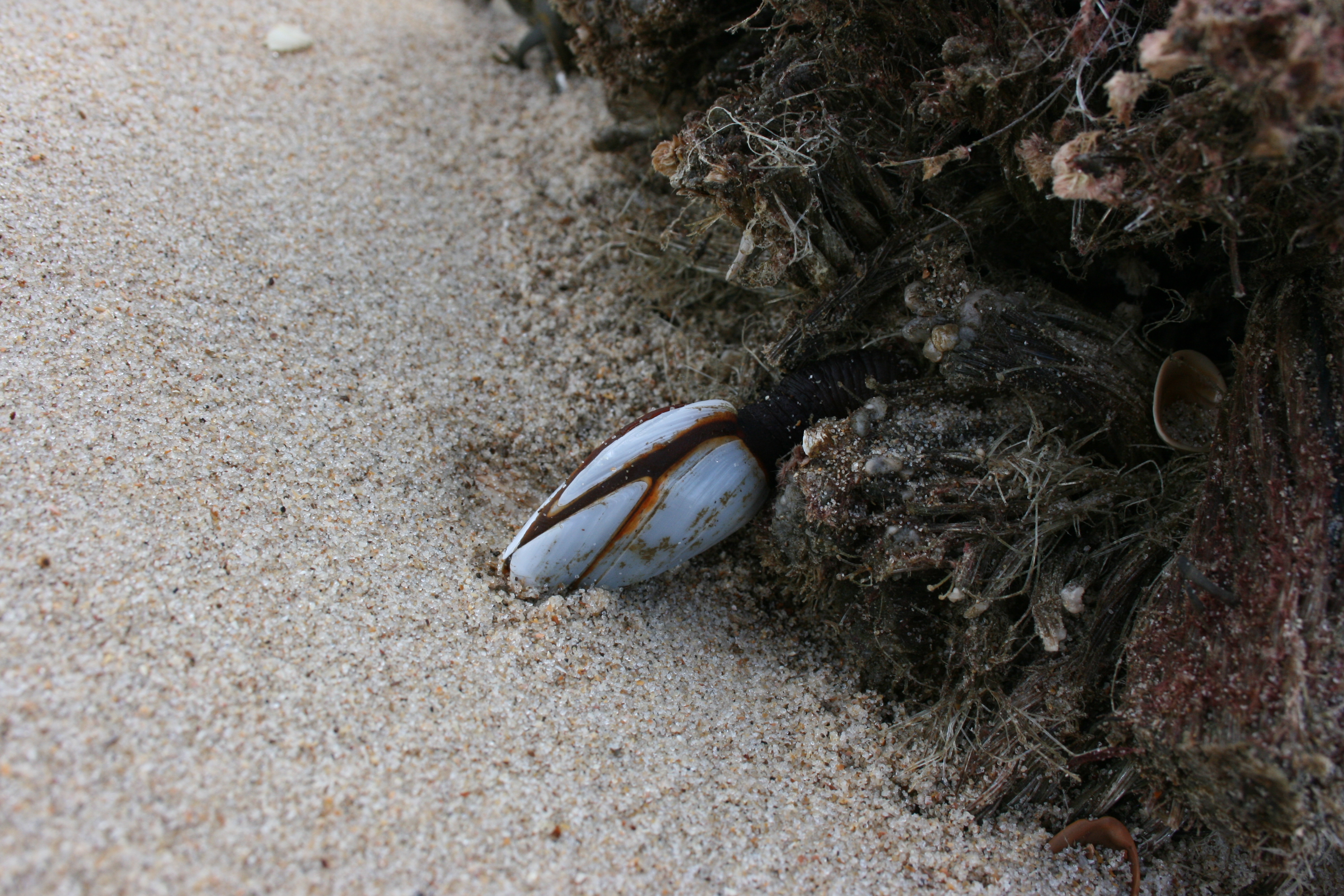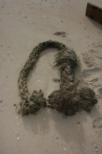 Op de laatste dag van onze vakantie liep ik 's ochtends rond kwart over 7 over het Egmondse strand. Het beloofde een mooie dag te worden. Het was 16 augustus 2009 en er lagen allemaal kleine wiertjes en bolletjes van het Japansbessenwier in de eb-lijn. Ik kwam een jutter uit Castricum tegen die een mooie grote patella gevonden had en ik liet hem een bosje met 10 haaieneieren zien dat ik gevonden had. Het was mooi weer en heerlijk rustig op het strand. Bij de duin afgang van kamp Bakkum ben ik omgekeerd. Uit het water haalde ik een plank en nam deze op mijn schouder mee. Bij de afgang van Egmond Binnen gekomen zag ik een hoopje aan de vloedlijn liggen. Dus even kijken. Het bleek een stuk touw te zijn. Op dat touw zaten wat eendenmosselen en dat trok mijn aandacht.