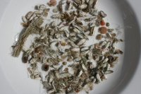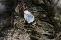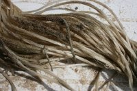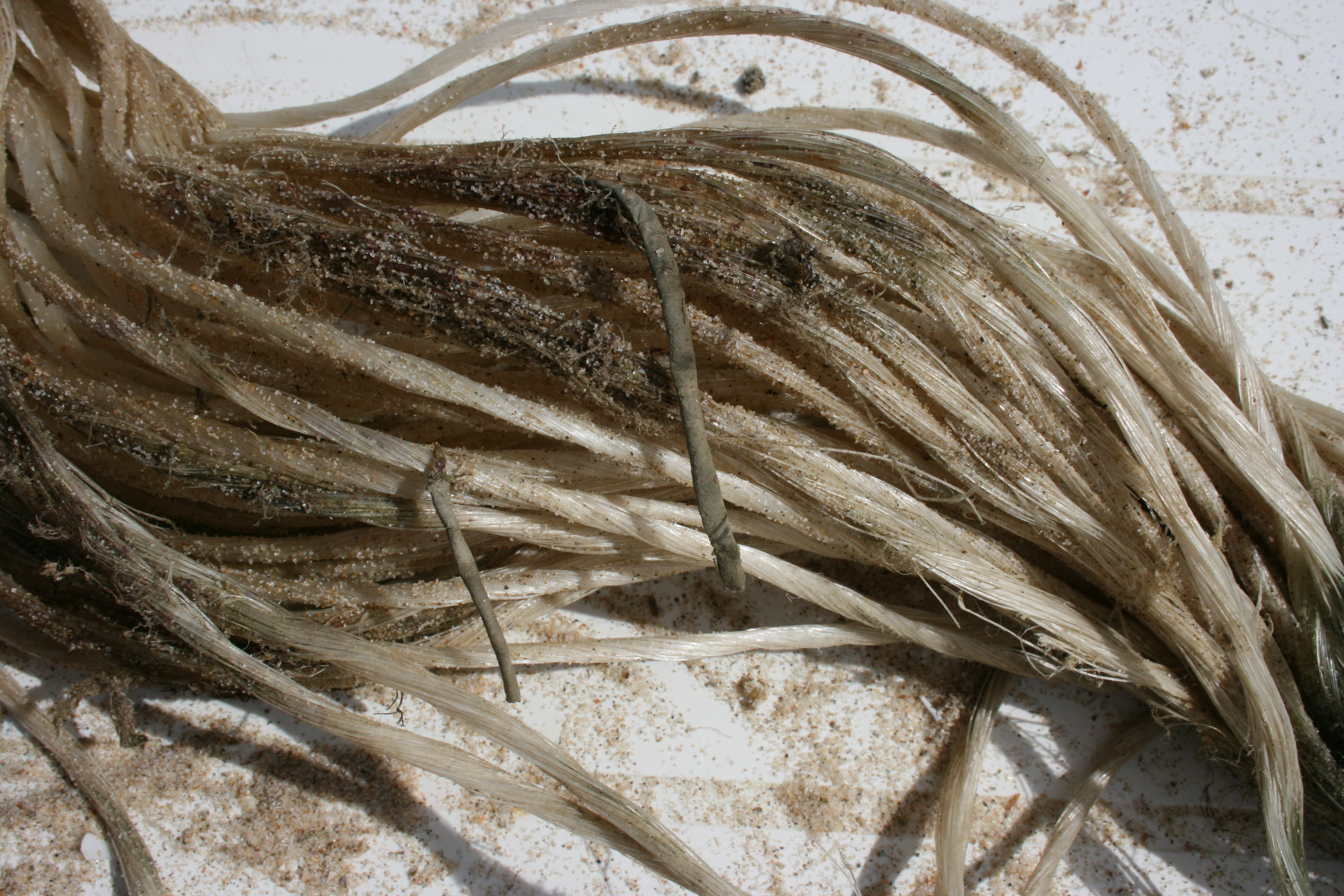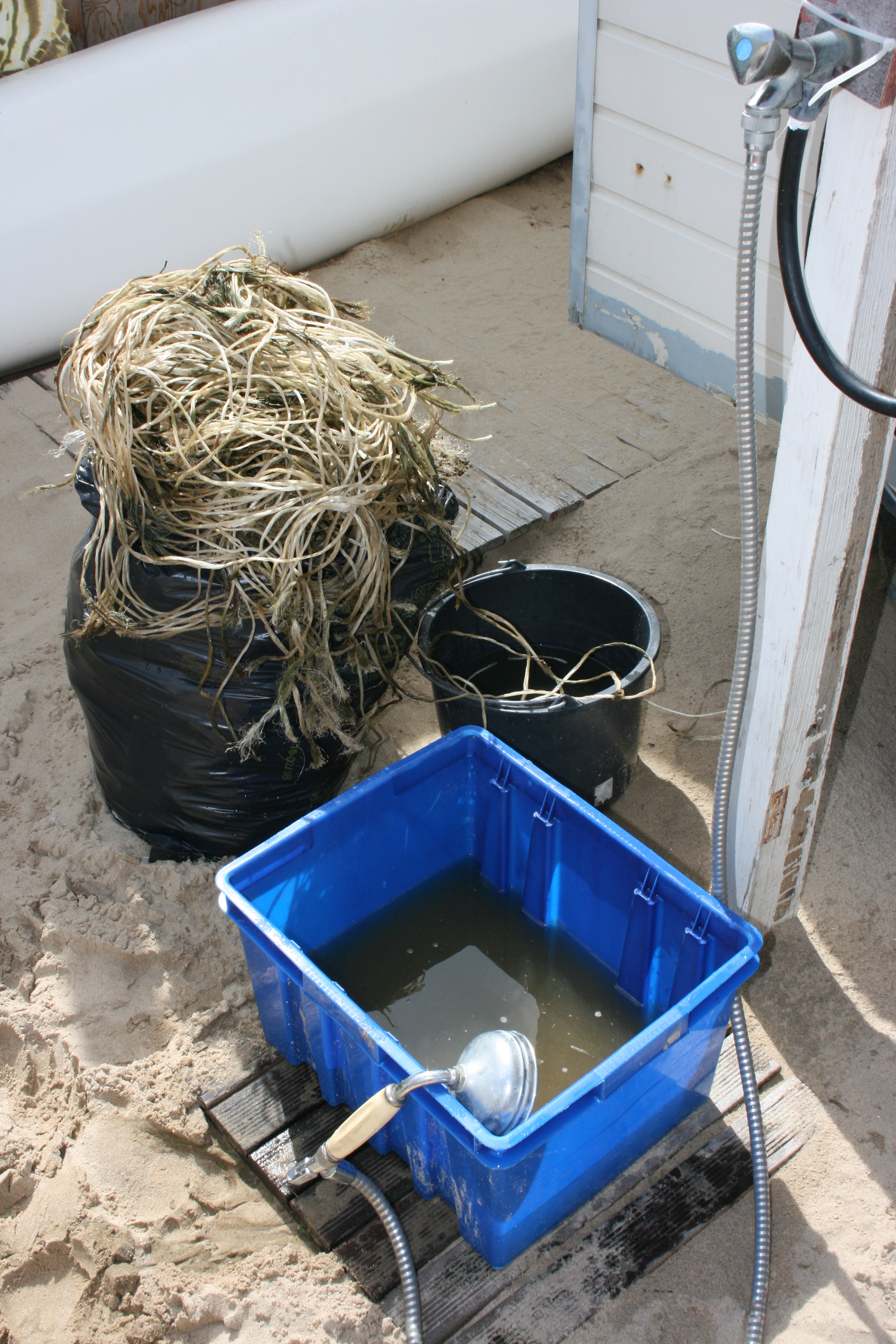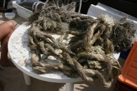 Wachtend op Anneke vond ik ook nog een aantal gemarmerde streepschelpen. Samen hebben we touw en plank met het karretje naar ons strandhuisje gebracht. Aldaar hebben we het stuk touw in drieën gezaagd en uit elkaar gedraaid. De uitgeplozen stukken werden gewassen. En als laatste werd het was water gezeefd.