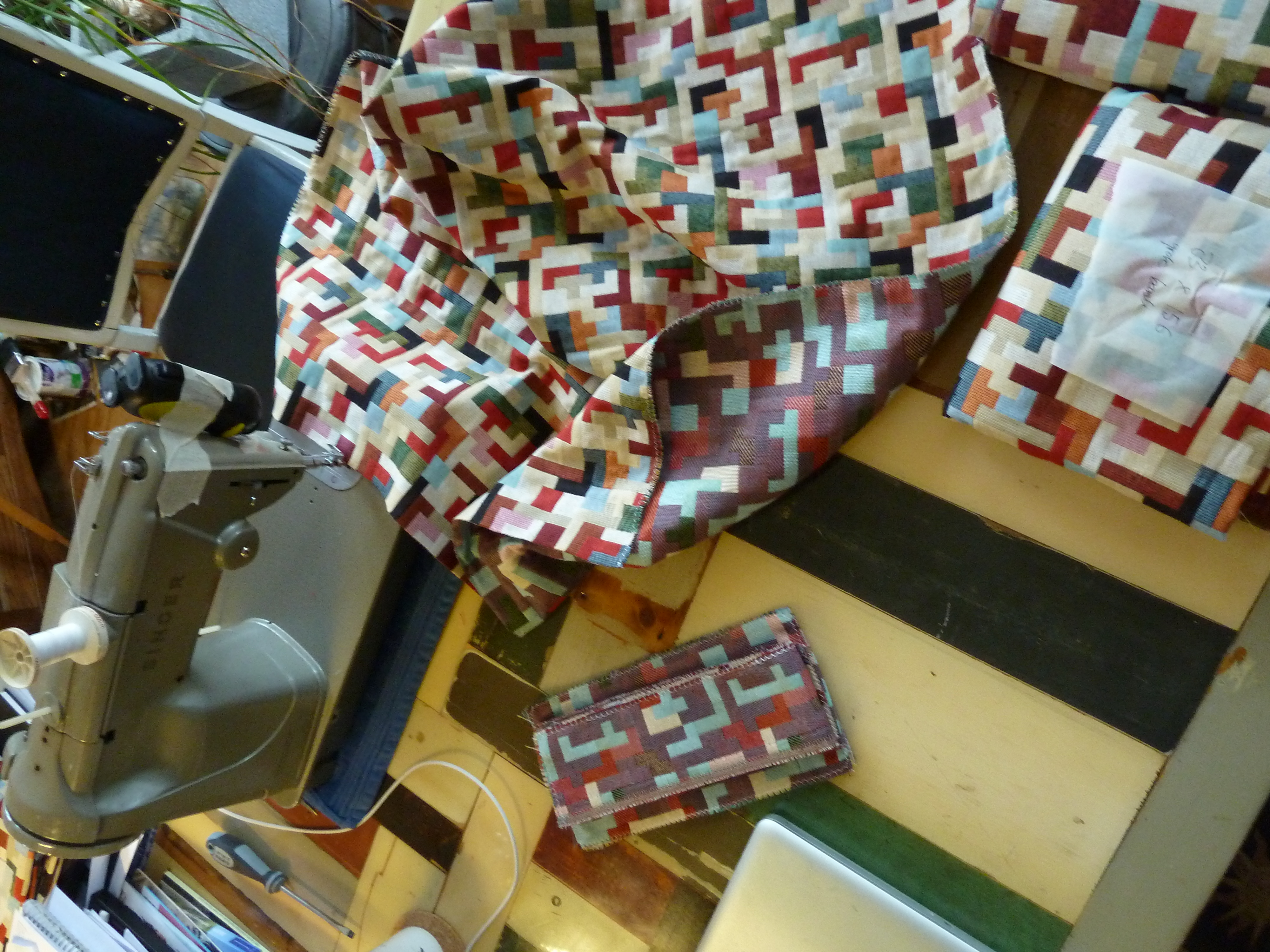 Anneke heeft zich geworpen op het maken van de bekleding van de banken. Dat begint er heel fraai uit te zien, maar het is altijd weer spannend of er genoeg stof is.