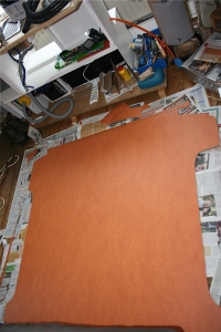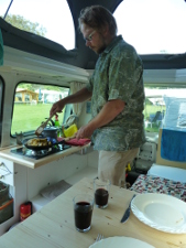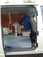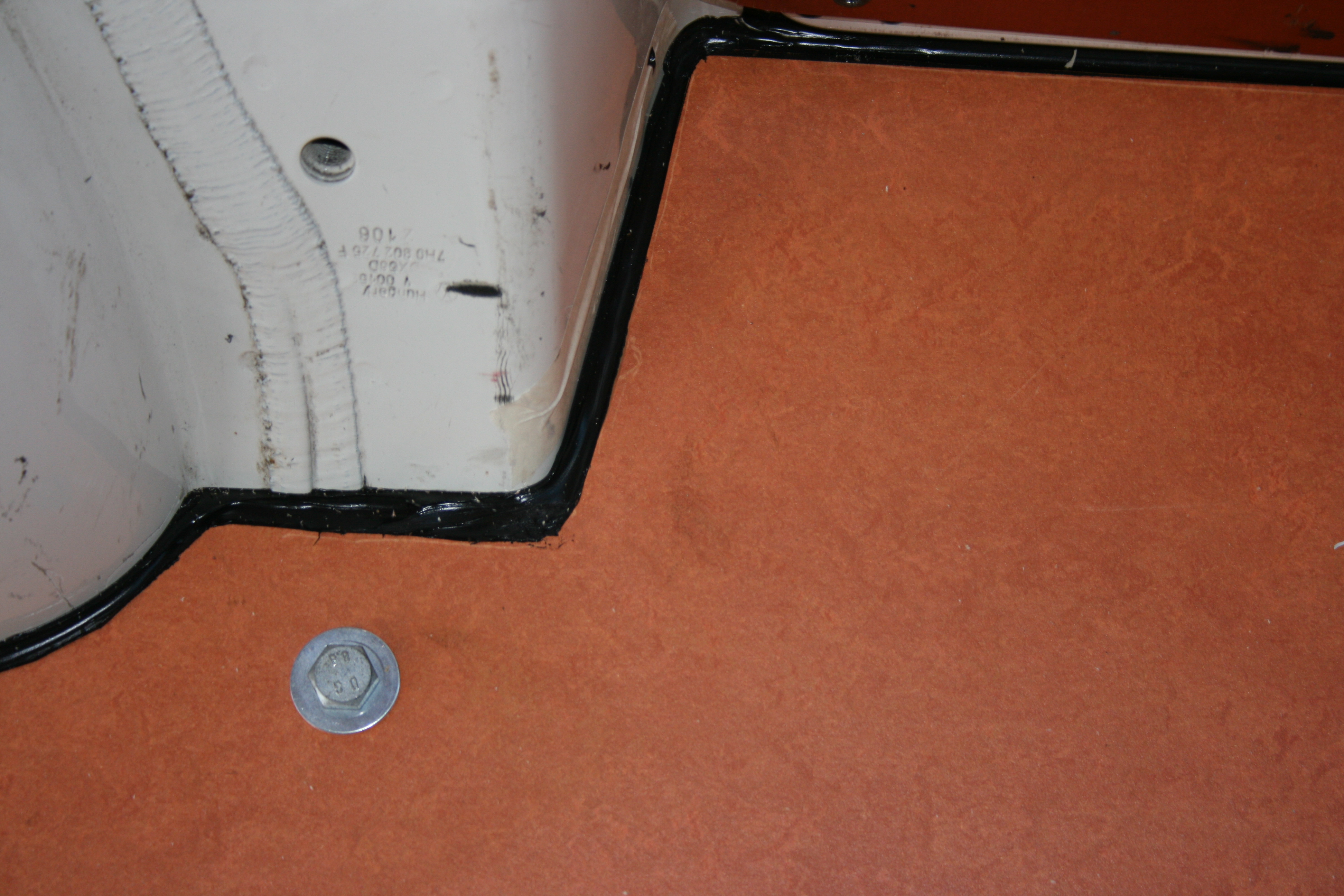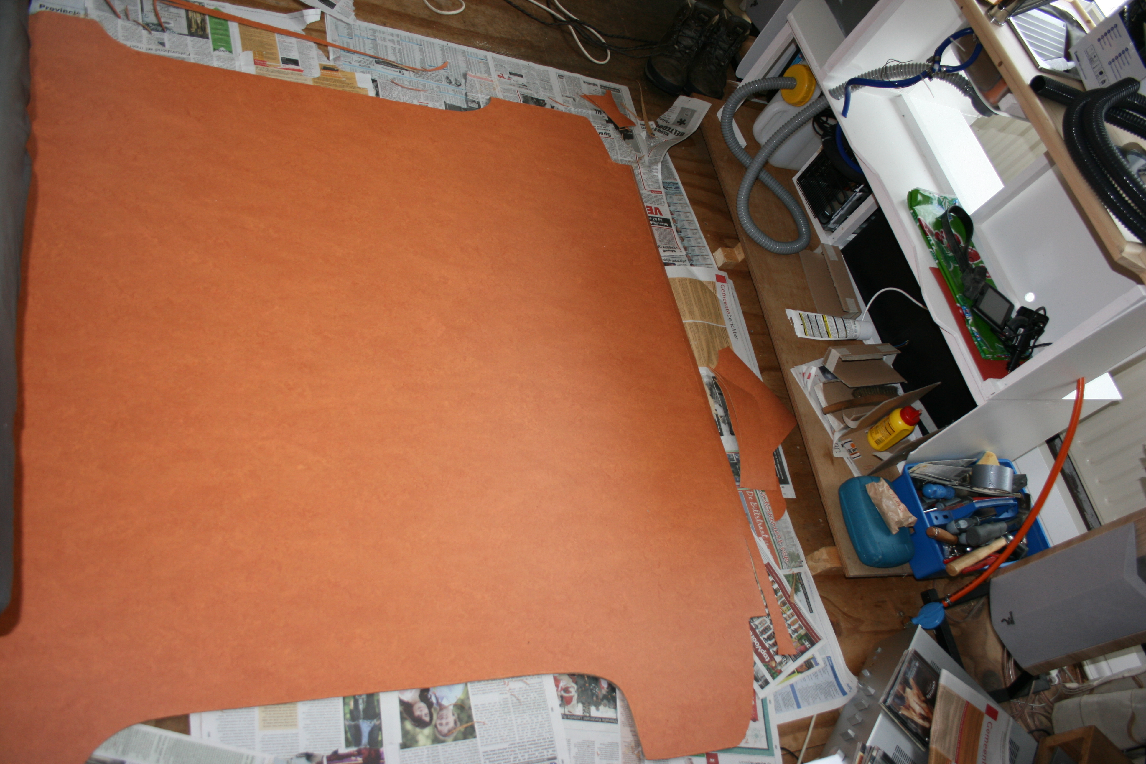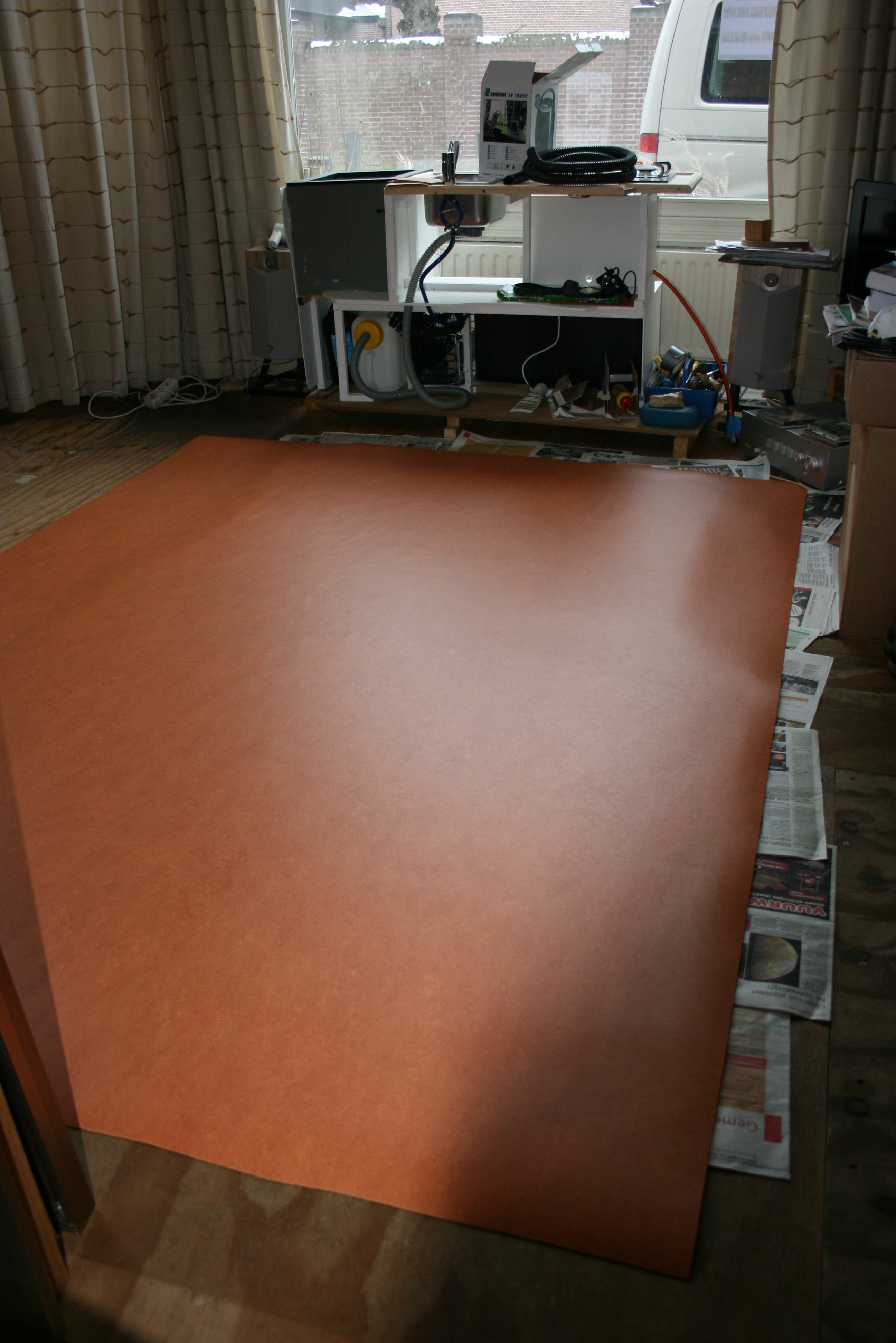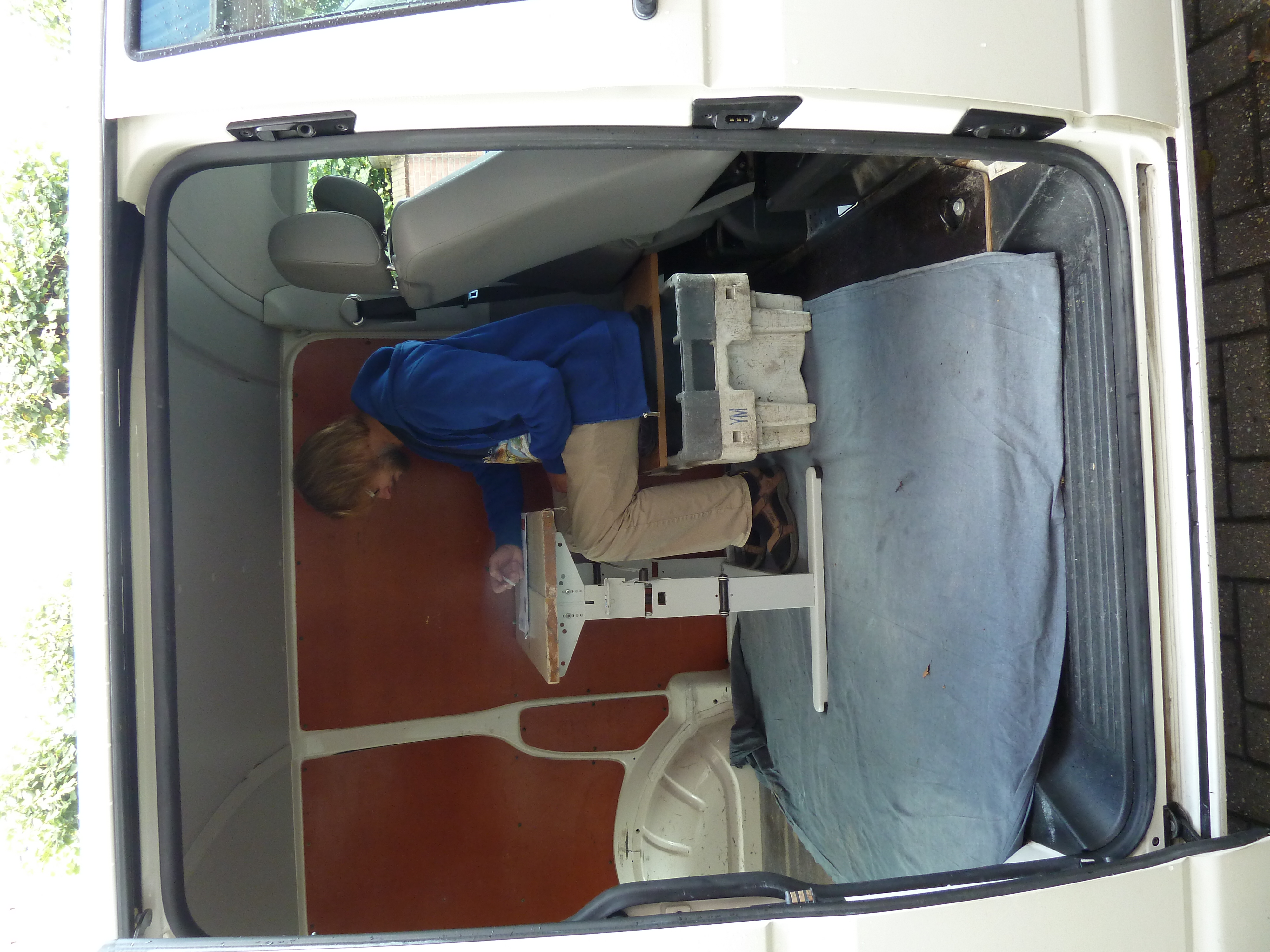 's Middags hebben we de betonplex-plaat met een schuurmachine opgeschuurt, zodat ze iets ruwer werd en we zeker wisten dat er geen lijmwerende delen meer zouden zijn. Binnen in huis werd de bank van zijn haken gehaald en werd het marmoleum op de betonplexplaat geplakt. Regelmatig hebben we de boel met een bezem met handdoek eromheen aangeduwd zodat alles strak en glad op elkaar komt te zitten. Na een nachtje drogen hebben ik het overtollige linoleum verwijderd. Nadat de gaten voor de bouten opnieuw waren geboord was onze vloer klaar om in de bus geplaatst te worden.