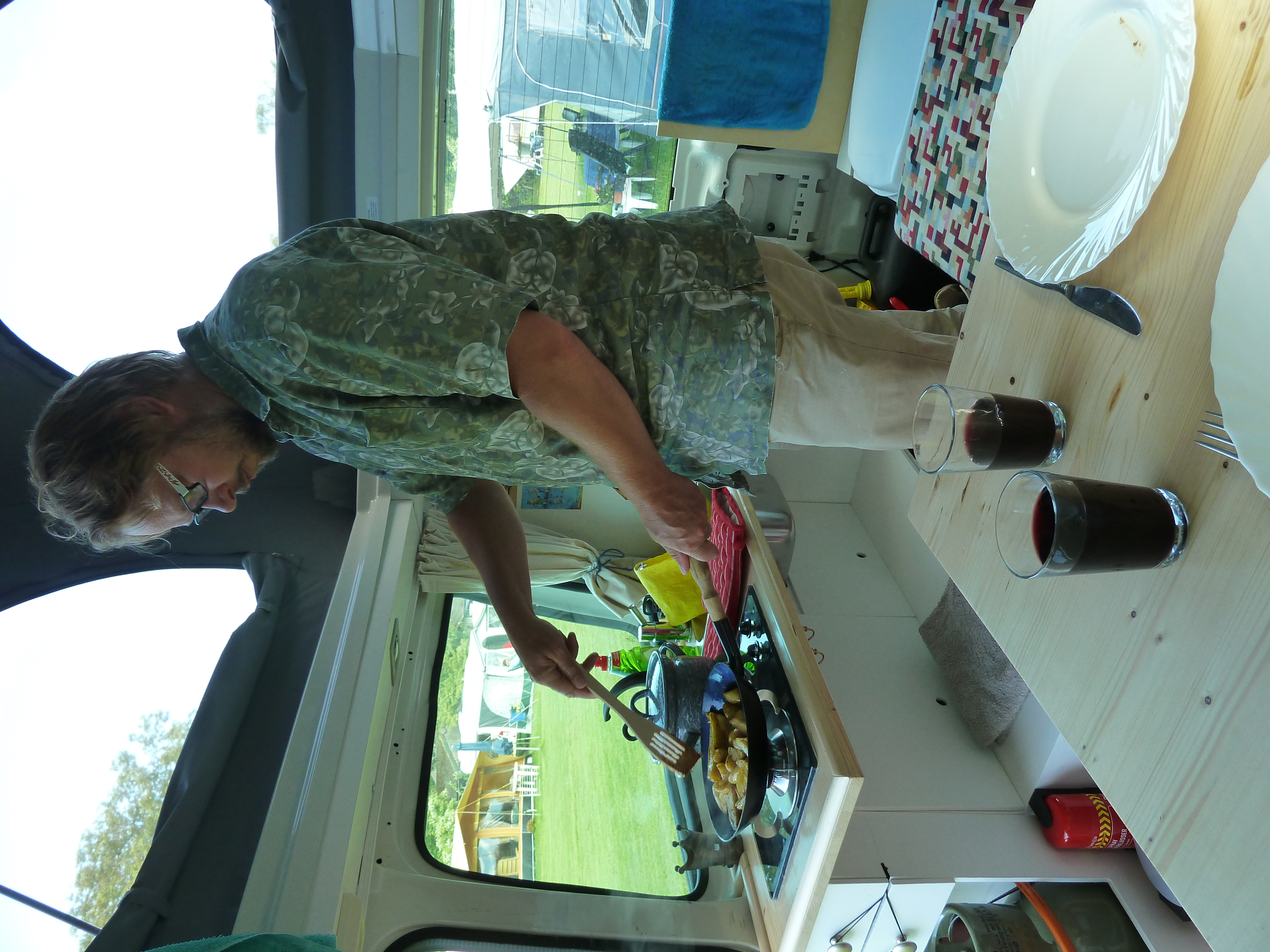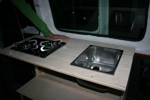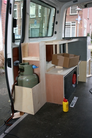 Door vrieskou in januari (en februari) kunnen we buiten niet veel doen, primer, siliconenkit en montagekit kan je geen van allen gebruiken bij temperaturen onder de 5°C. Dus wordt er binnen een beetje gerommeld met de montage van gas en water, en worden de eerste voorbereidingen gedaan voor de electra. Zo wordt binnenshuis een extra keuken gemaakt, die straks hoplijk in een geheel de bus in kan.