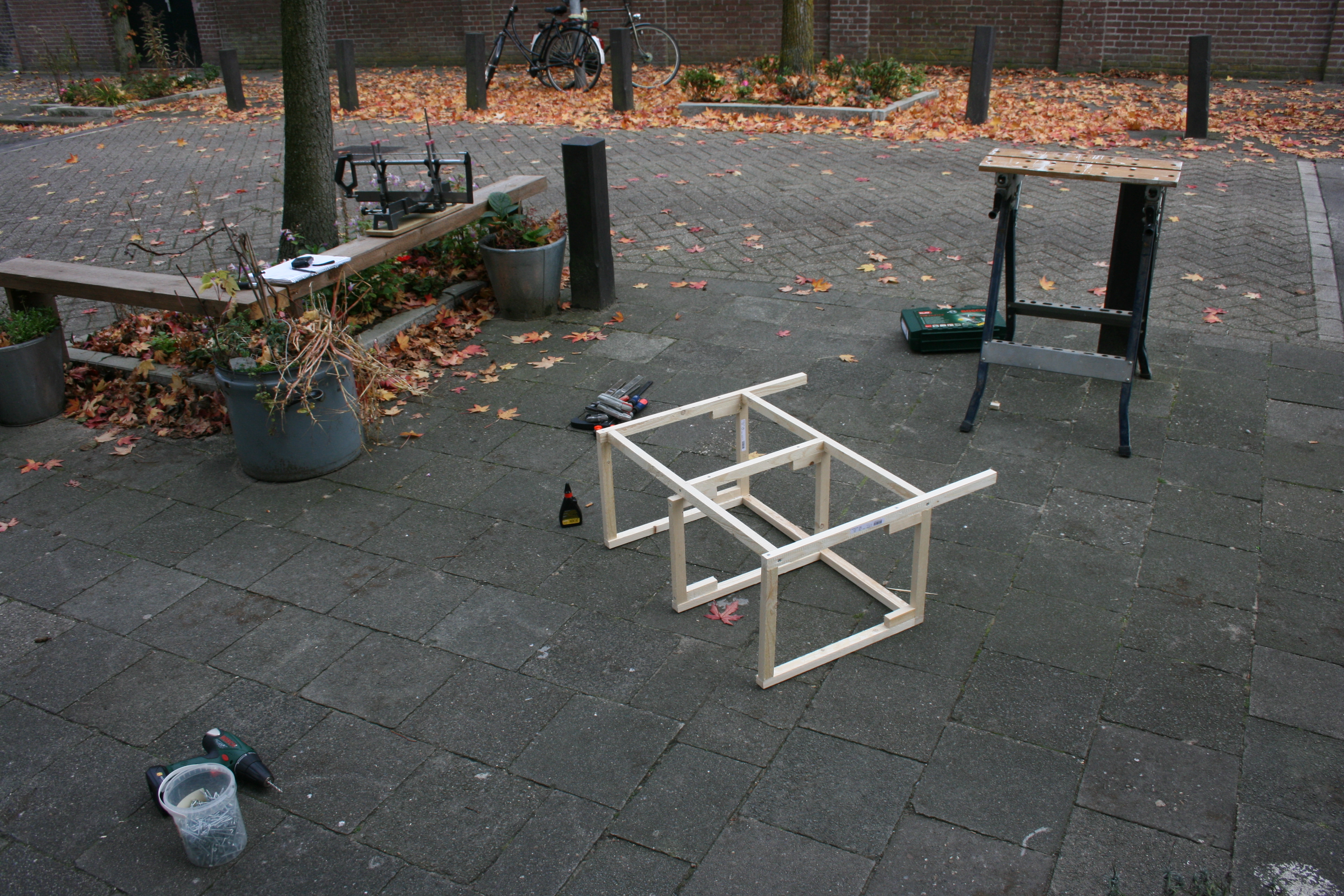 Op 21 oktober 's middags, het mag dan mijn verjaardag zijn, toch was het nodig om nog even snel een stukje van de bank in elkaar te zetten. Het hout was vrijdag al gezaagd, dus het was niet al te veel werk en kon nog net voor de visite zou komen.