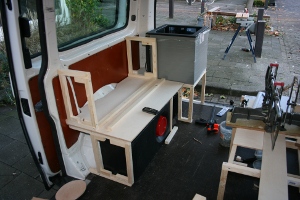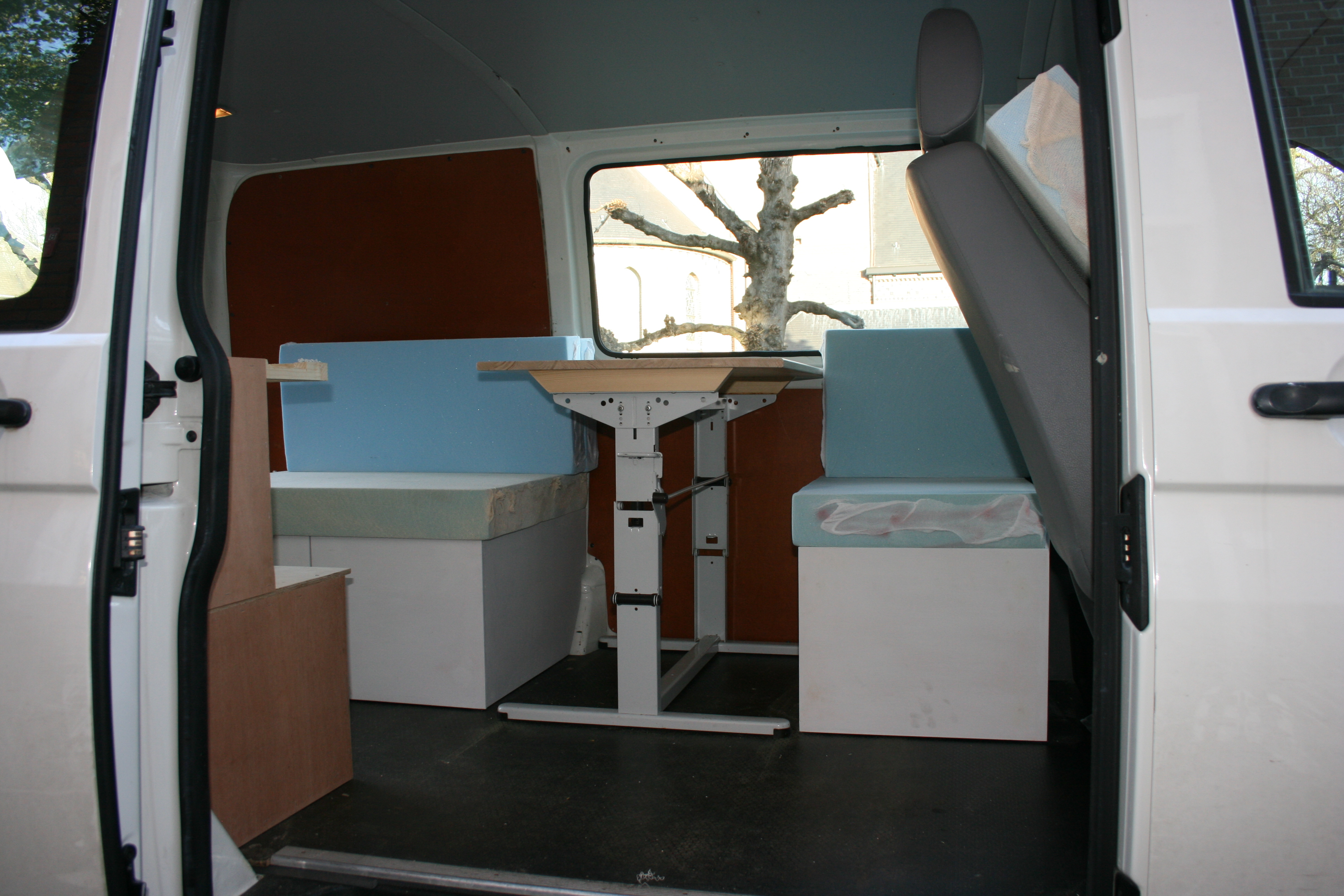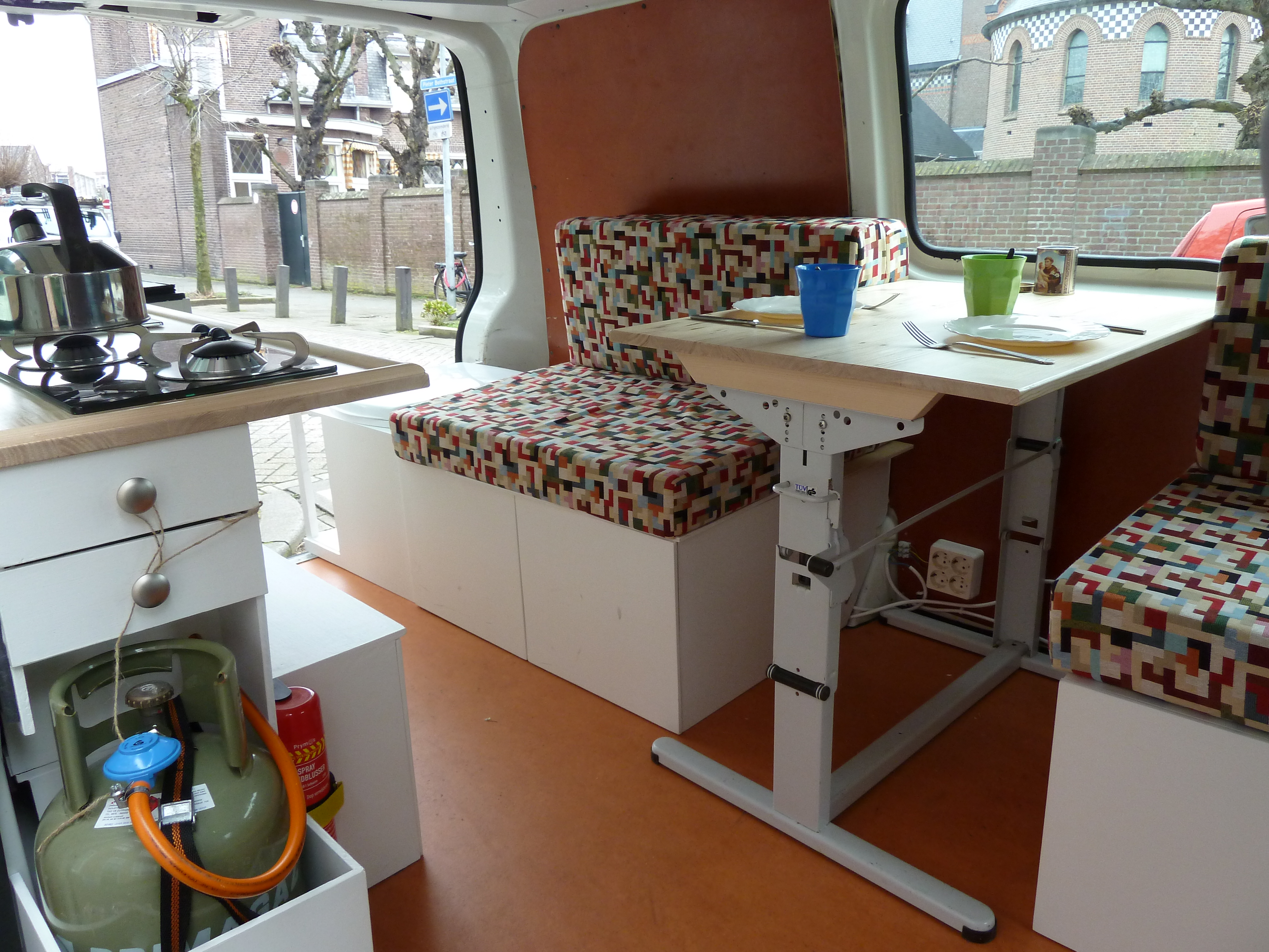 Na het weekend van 16 tot 18 november is ook de ombouw voor het toilet bijna klaar en is het tafelblad gemonteerd op de voet. Stoer hoor zo'n klaptafel in de bus.