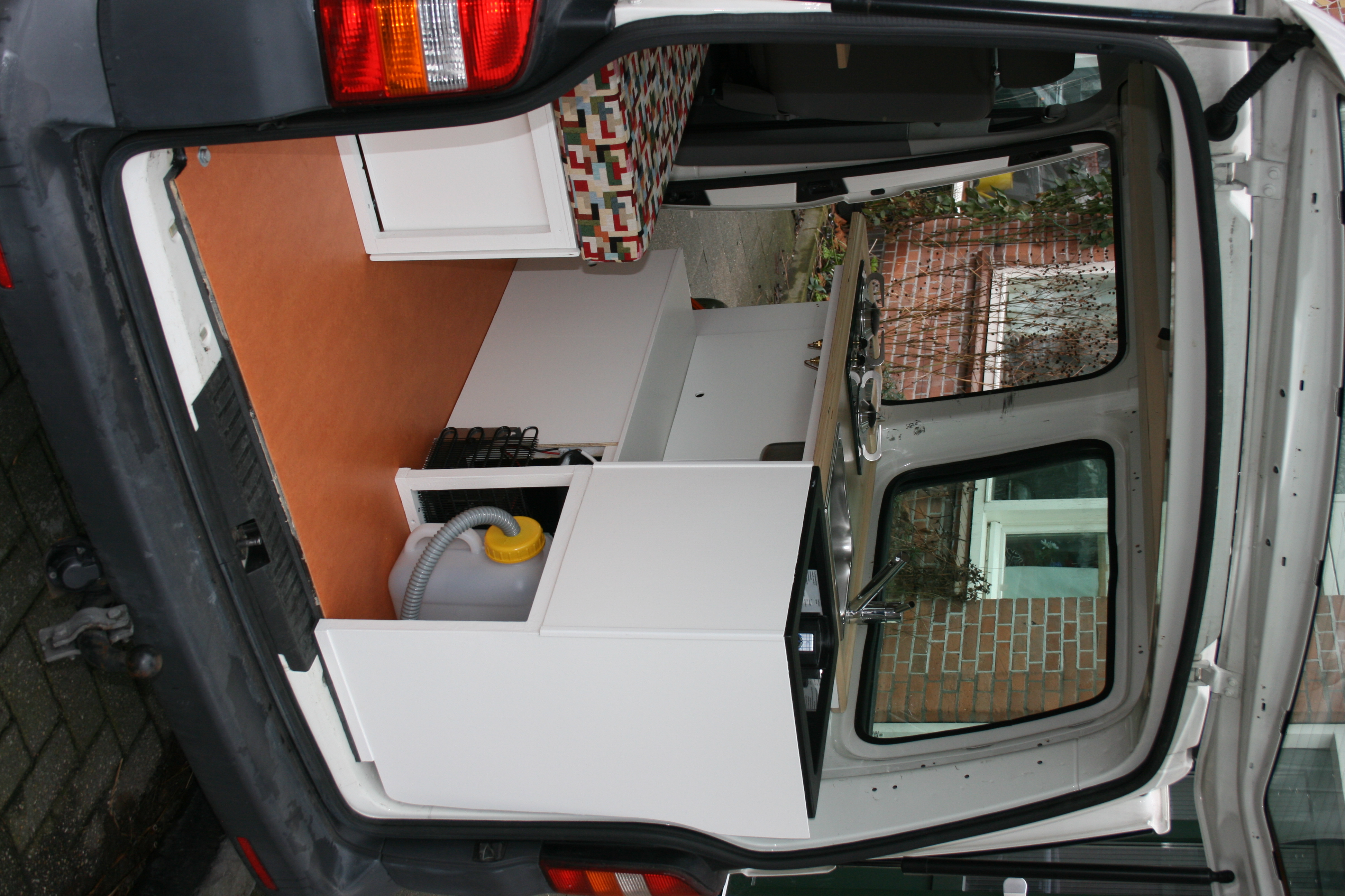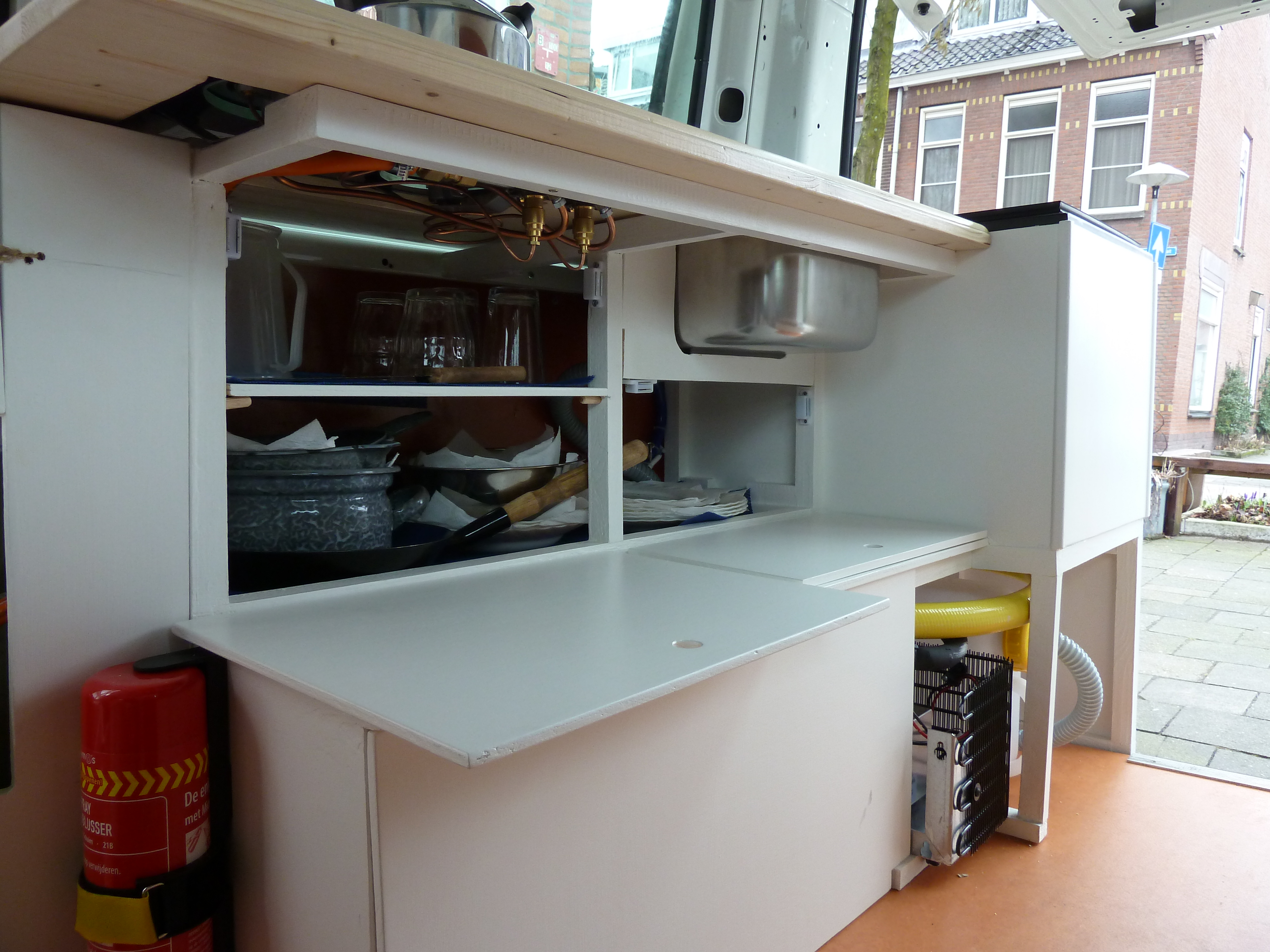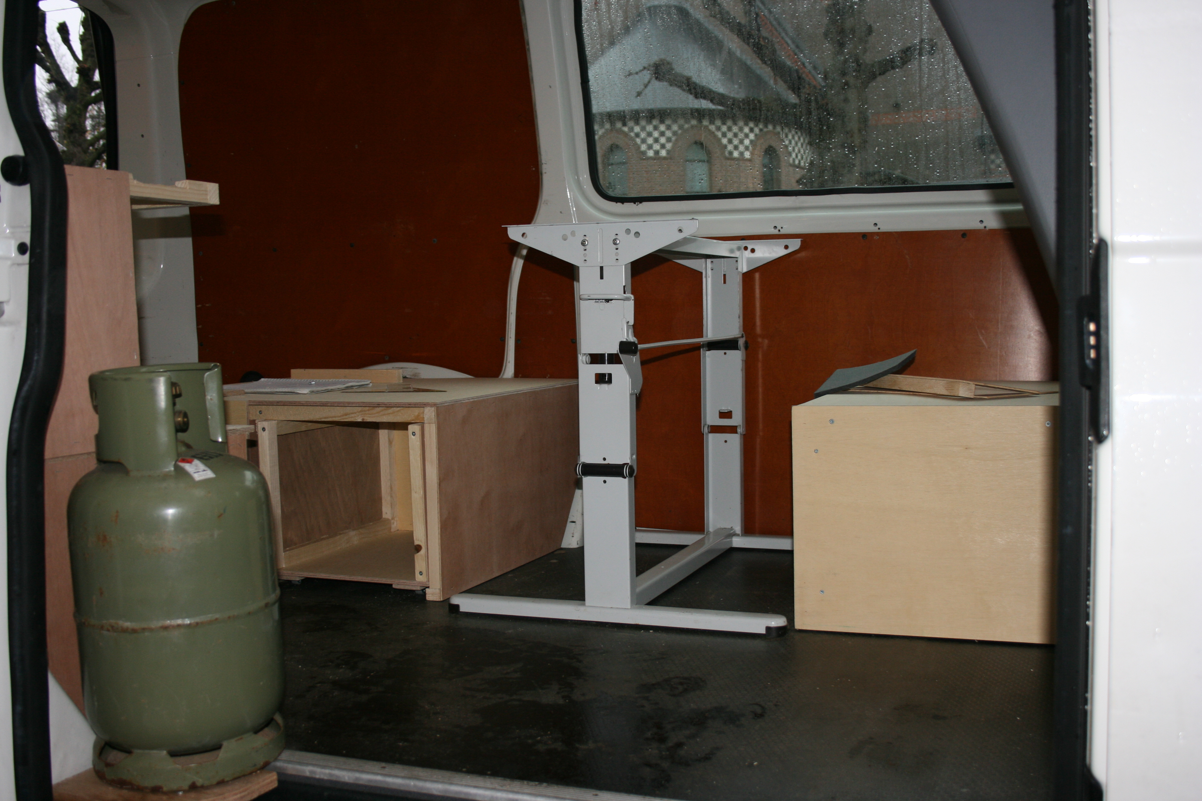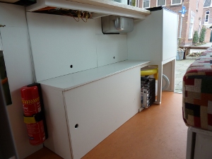 Daarna zijn we naar Schijndel gereden om bij De Wit alles in te kopen dat we nodig denken te hebben voor de keuken, zoals een gasstel, een spoelbak, leidingen en vaten. De aankomende week heb ik vrij, dus daar wil ik optimaal van profiteren. De rest van het weekend ben ik bezig geweest om het onderstel te verbeteren. Door passen en meten heb ik toch besloten de koelkast op een andere plaats te zetten. Met deze wijziging maken we optimaal gebruik van de aanwezige ruimte door een loos stuk direct voor de achterklep ook te gebruiken.