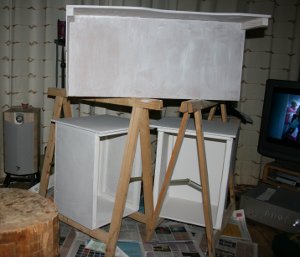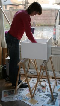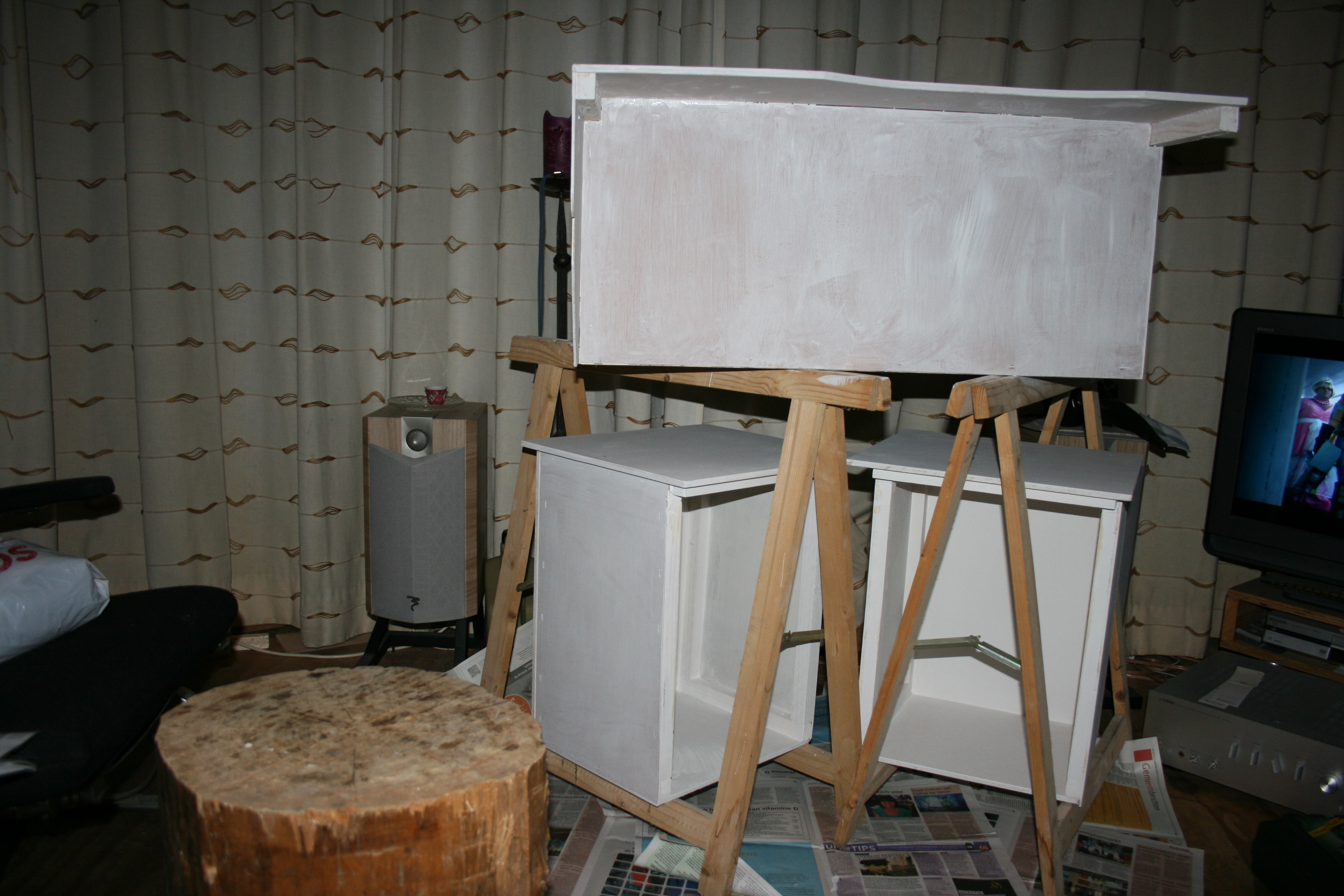 Nu de tafel in elkaar zit en het aanrechtblad ook gelakt is, bestaan mijn avonden uit een keuze van plamuren, schuren en/of schilderen. kortom veel werk en weinig visuele vooruitgang. Geef mij maar het maken van de banken of kasten, maar ja met alles in een kleur wordt het wel een geheel. Ik schilder met een ecoverf op waterbasis, de grondverf is behoorlijk zwaar schilderen, je krijgt de neiging om de verf te verdunnen met water. Daar staat tegenover dat twee lagen grondverf meer dan genoeg lijken te zijn, terwijl ik er drie gepland had, dus een mooie meevaller.