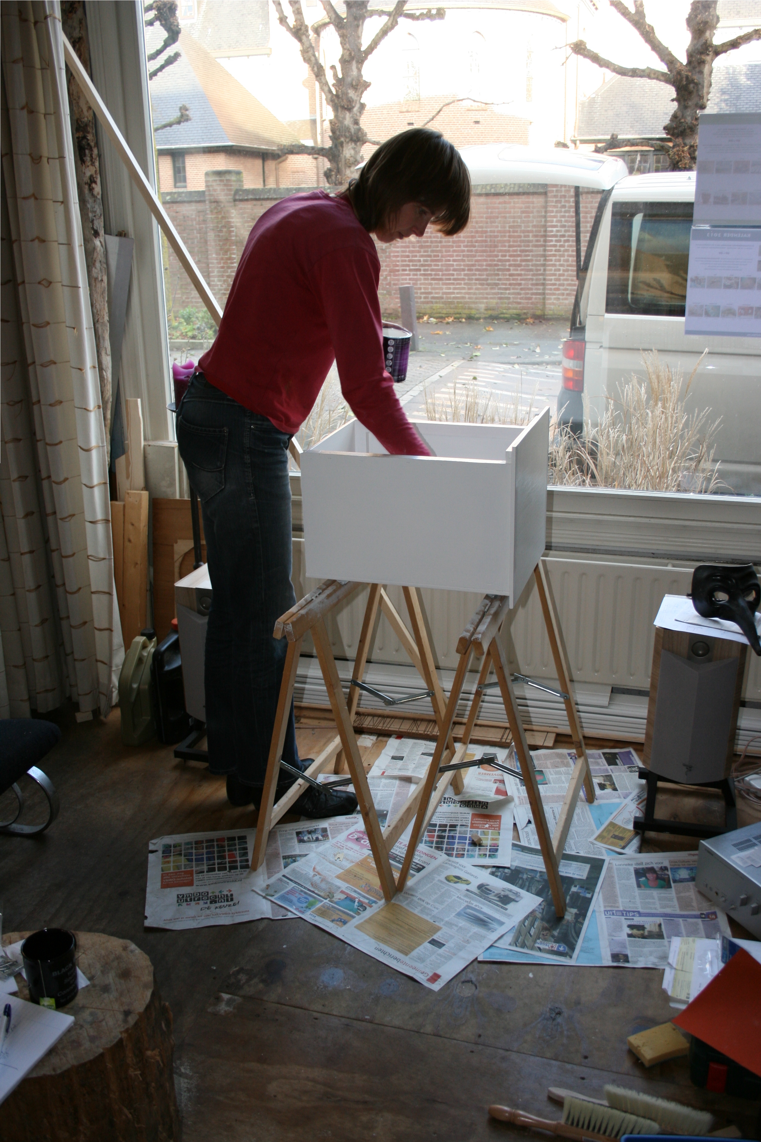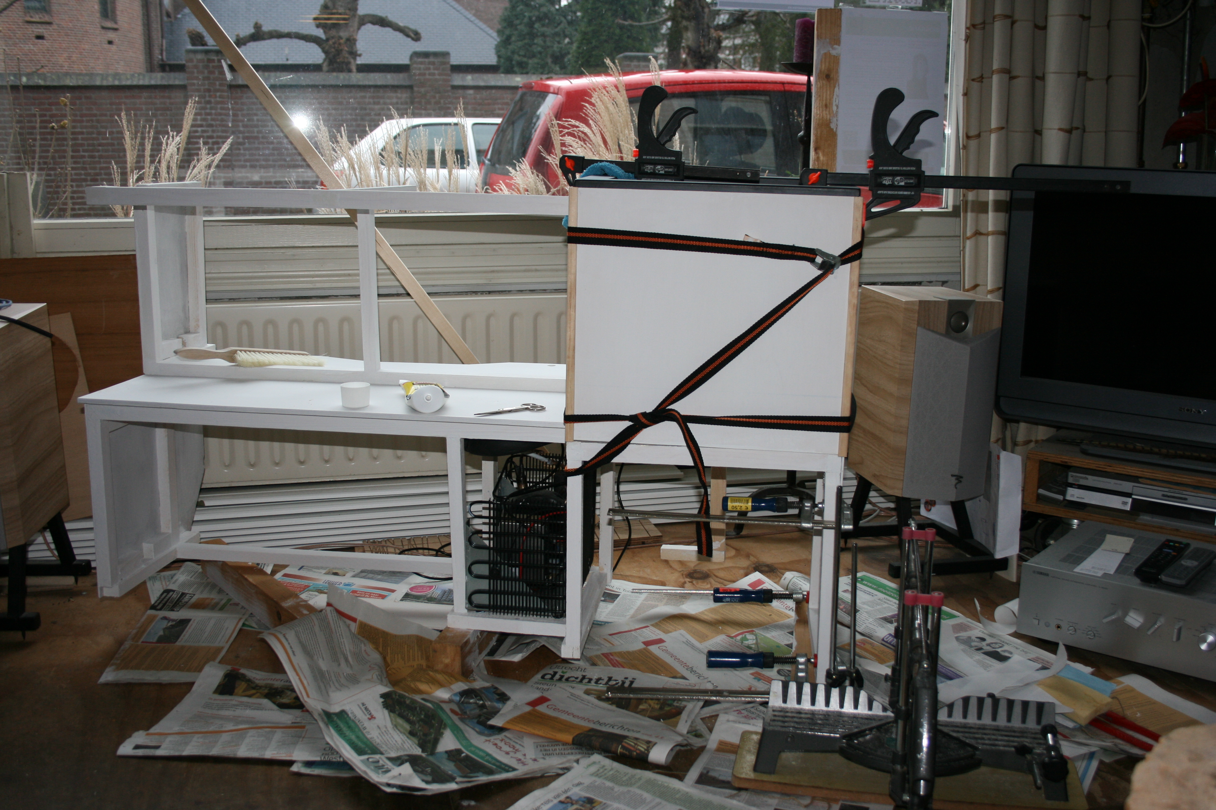 Maandag 5 november hebben we de knoop doorgehakt: al het schilderwerk gaat gedaan worden in RAL9010 (wit met een klein beetje geel). De koelkast heeft zijn plek gekregen en zit nu vast op het frame. Ook het frame van het keukenkastje zit in elkaar, dit wordt de plek voor de pannen, borden en kopjes.
