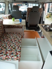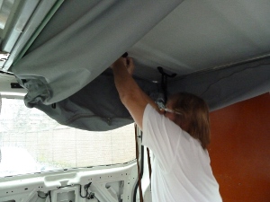 Anneke is op 1 maart begonnen aan de gordijnen, en ik doe tutklusjes: een afwerk stripje hier, een latje daar, een beetje lakken, de WC op zijn plaats zetten en de benodigde electra daarvoor aansluiten, even een extra houtstripje zodat een magneetje beter functioneerd, etc. Kortom ik vermaak me wel en zet de puntjes op de i. We hebben inmiddels ook een afspraak met de RDW en als alles goed gaat dan wordt de bus op maandag 4 maart gekeurd en als camper goed bevonden. Spannend!