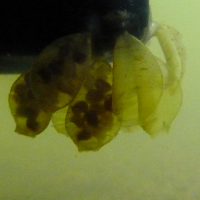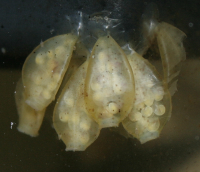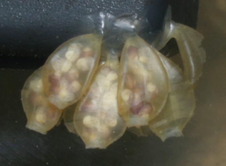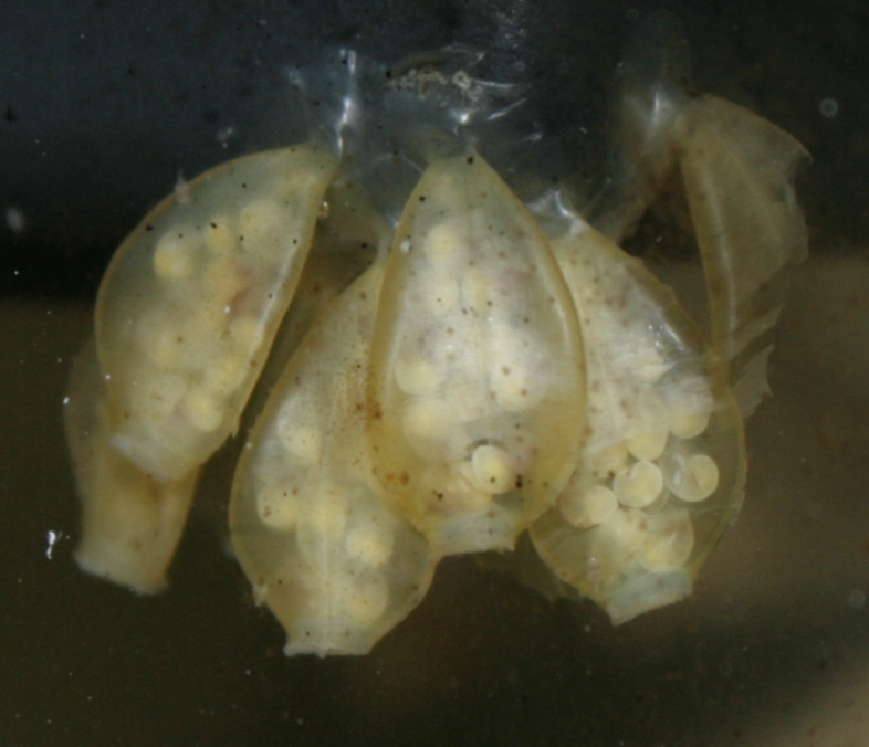| Eieren | Vrouwtjes maken daarbij 20-40 plastic- tot leerachtige, deels doorzichtige, vaasvormige eiercapsules vast aan een harde ondergrond.A |