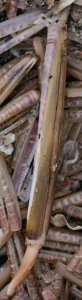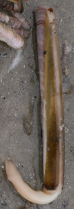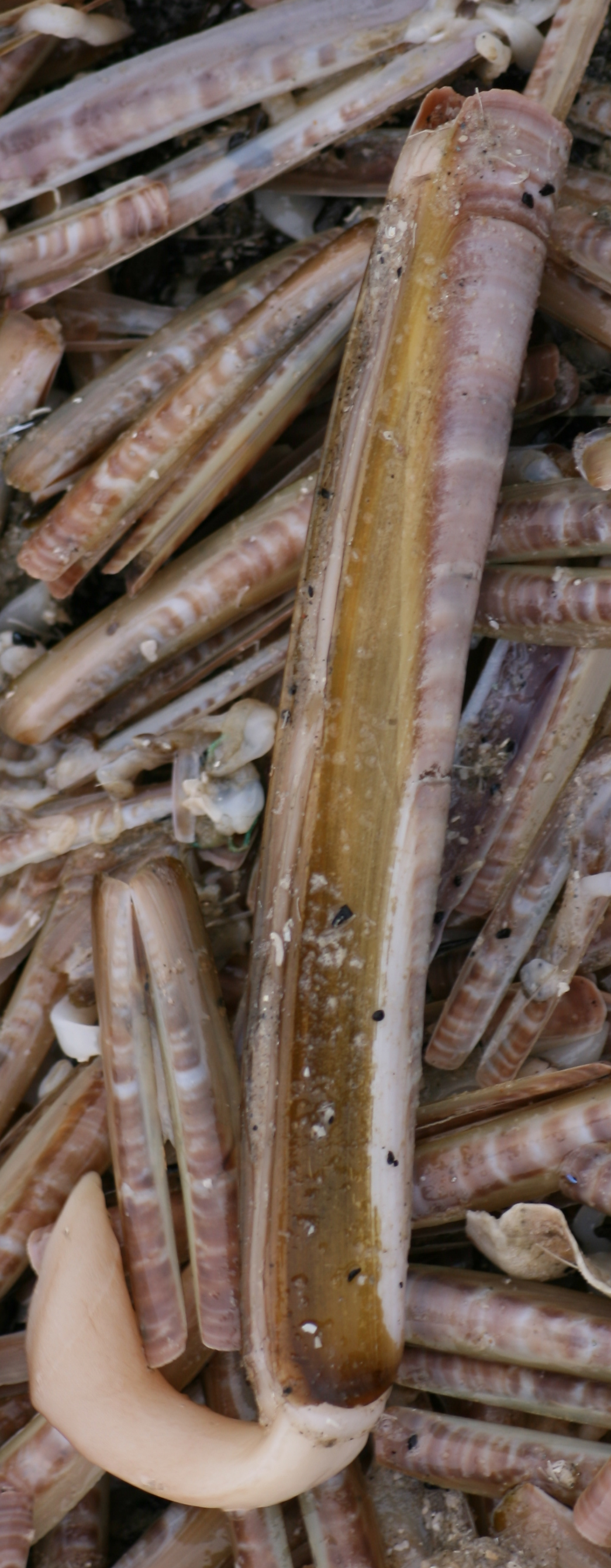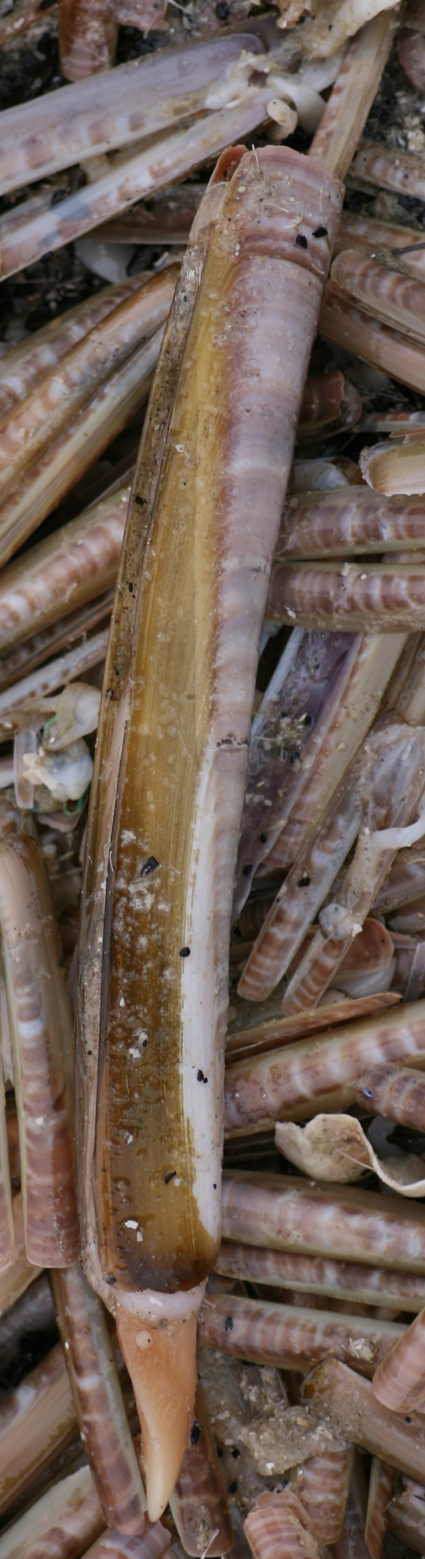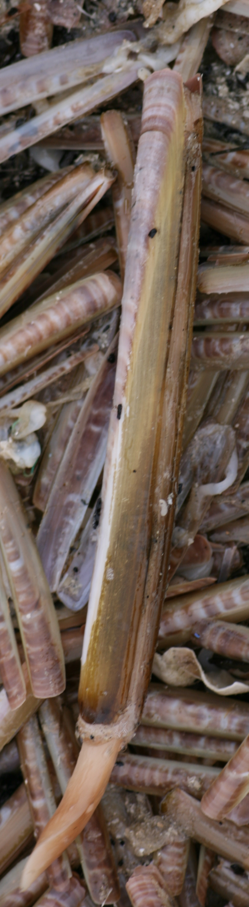| Messchede (Solen marginatus) Is de schelp vrijwel recht met een duidelijk gleuf evenwijdig aan de voorrand, het voorste spierindruksel is korter dan het ligament en er zijn geen laterale tanden? |  |