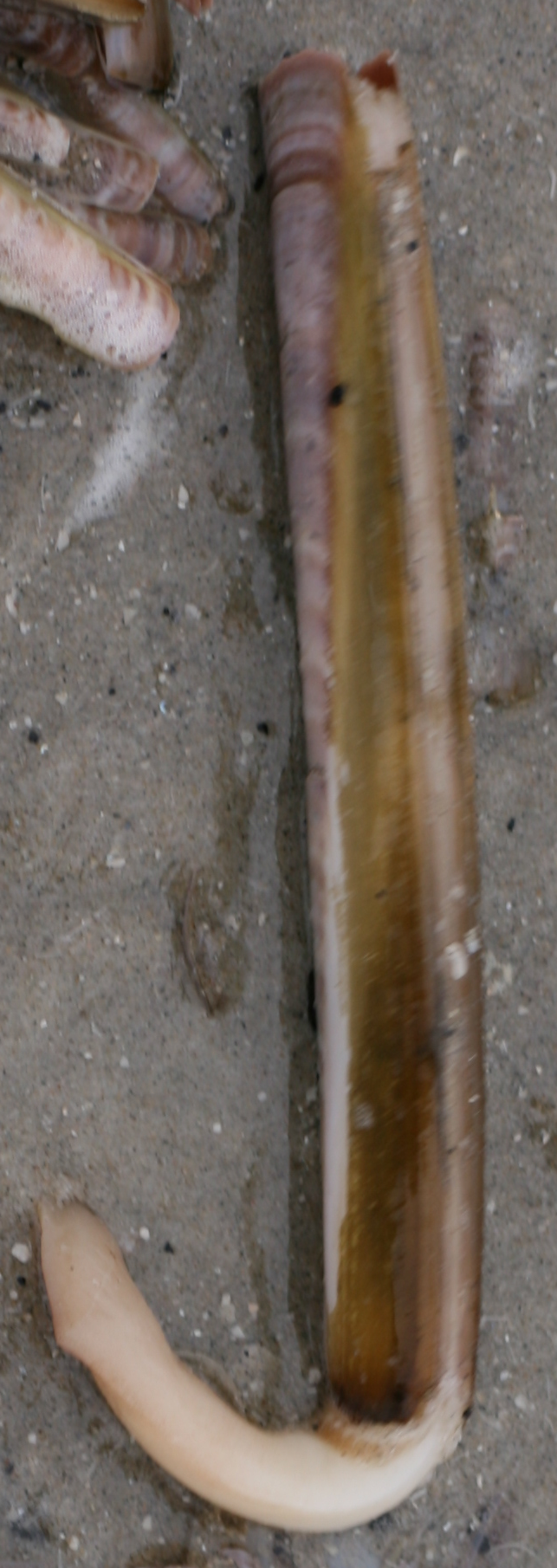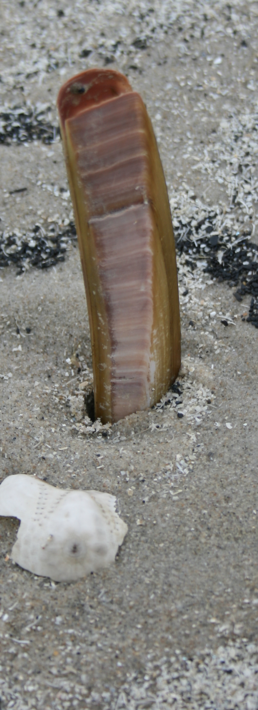 | Habitat | : | Zij leven rechtop ingegraven in het zand. Met hun krachtige voet kunnen ze zich snel ingraven. Tijdens de vloed komen de boven het zand met hun siphonen om zich te voeden. Bij de eb graven ze zich weer in soms tot wel 50 cm diep.  |