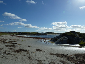 De Åkrasanden bestaat uit een aantal inhammen gelegen aan de Norskerenna. Het lijken prachtig witte stranden zandstranden te zijn, maar eigenlijk bestaat het voor het merendeel uit foraminiferen, zoals bleek toen ik thuis het gruis ging uitzoeken van dit strand. Het strand was enorm rijk aan Muizenkeuteltjes en heel veel andere schelpen.