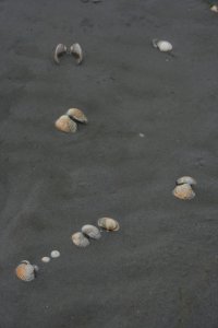 Na wat gegeten te hebben in Hollum fietsend terug naar Ballum, waar we nog tijd over hadden, we wilden de boot van 16:30 terug naar het vaste land. Dus nog even snel naar het strand van Ballum gefietst (6). Nou ja, strand. Een grote modderplaat met heel veel kokkels en verder eigenlijk niets, of het moet een verdwaalde gaper zijn. Deze kokkels lijken dikker en steviger dan die van het wad.