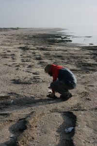 Nadat onze schoenen en kleding voldoende modderig waren geworden zijn we doorgegaan naar de haven (1). Volgens de kaart zou dat paal 11 moeten zijn. Het is een klein zandstrandje met kokkels en gapers en gelukkig ook grote stukken met heel veel horentjes, voornamelijk wadslakjes. Maar Anneke had het inmiddels zo koud gekregen en heel veel honger dat we er niet heel veel tijd aan hebben besteed. Ik heb een paar handen in een plastic zakje gedaan en nu maar hopen dat er obliehorentjes tussen zitten. Toen op naar Nes voor verwarming.