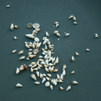 De laatste dag, dus de laatste kans op obliehorentjes. Via de Pietje Miedeweg naar het wad gefietst. De eerste de beste oversteekplaats genomen en op de zandplaat die er lag gaan zoeken (3). Mooie zandplaat met veel schelpen. Kleintjes, waaronder veel slakkenhuisjes en veel wat grotere schelpen die onder de klei vandaan komen. Tip: pas op dat de terugtocht niet afgesloten wordt door het opkomend tij. Wij kwamen tot de ontdekking bij het weggaan dat het smalle slootje langzaam vol begon te lopen. Geen idee hoe vol het loopt, maar als het helemaal volloopt is de terugweg afgesloten.