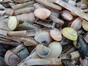 Hier lagen niet de hoeveelheden Zeeappels als in Koksijde maar toch kwamen we ze regelmatig tegen. Wel lagen hier weer enorme hoeveelheden Amerikaanse Zwaardschedes en dan vooral in de luwte van de dijken en Nonnetjes, heel veel Nonnetjes en bijna allemaal doubletten.