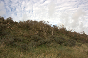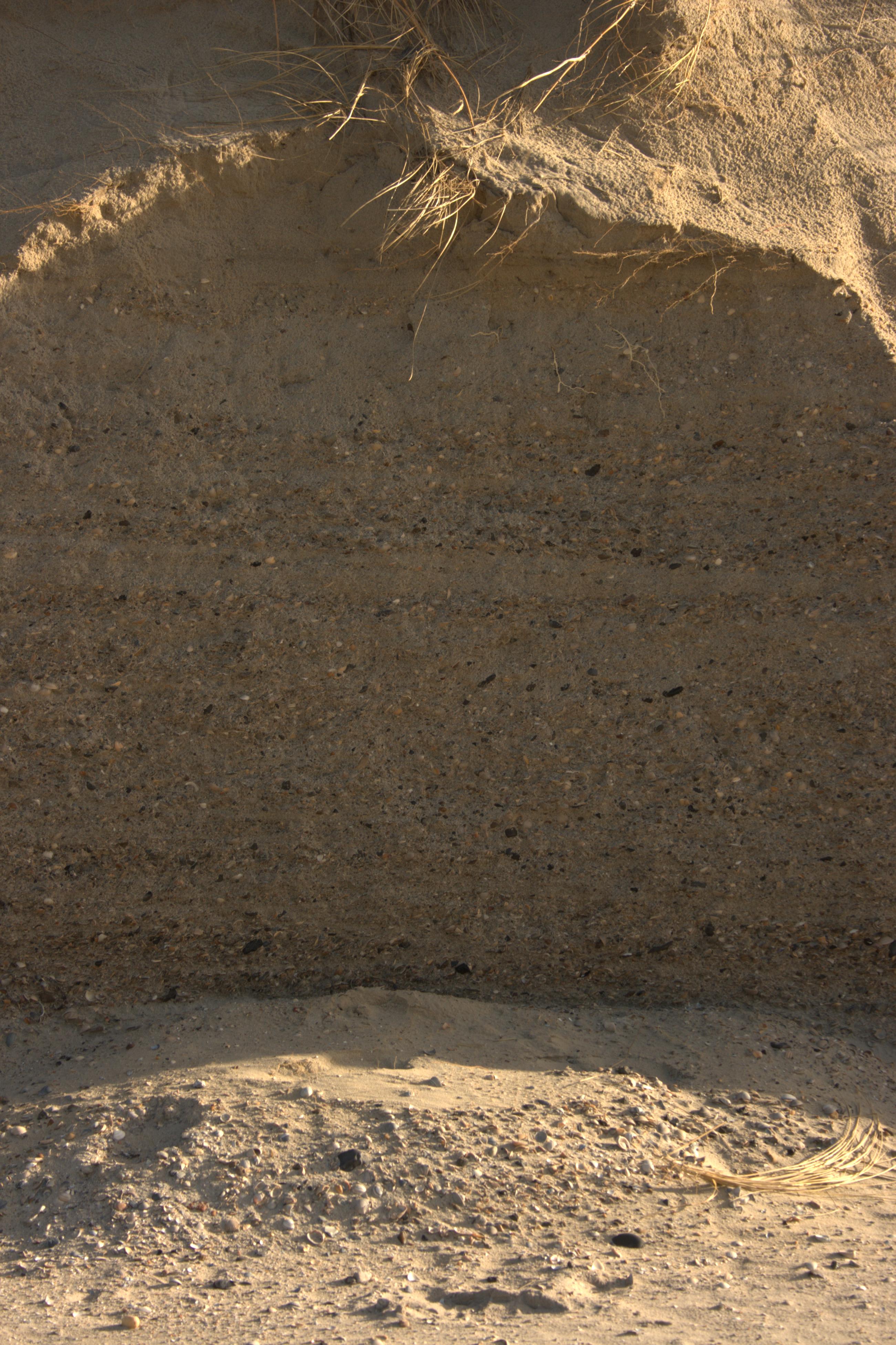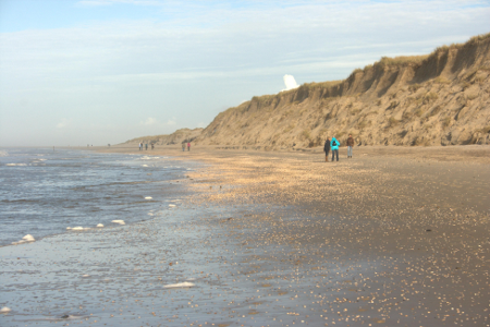 Na de lunch weer het strand op, maar nu richting de noord. Er was veel afslag op dit stuk strand. In de duinen waren de schelpen lagen zichtbaar. Ik had verwacht dat het oude banken zouden zijn, maar in de banken trof ik ook een stuk glas aan, dus zo oud kunnen ze niet zijn.